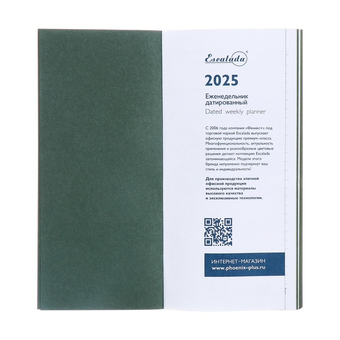 Еженедельник датированный 2025 года, 80х165 мм, 64 листа ESCALADA, мягкая обложка из искусственной кожи, блинтовое тиснение, блок 70 г/м², зелёный
