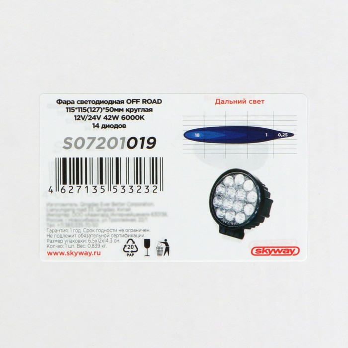 Фара светодиодная Skyway OFF ROAD, 12/24 В, 42 Вт, 6000 K, 14 диодов, 115 мм