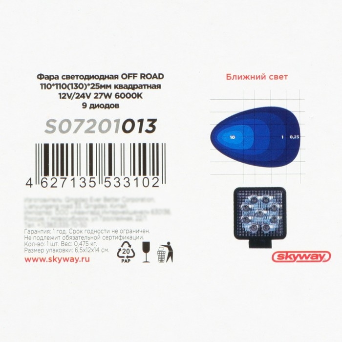 Фара светодиодная Skyway OFF ROAD, квадратная, 12/24 В, 27 Вт, 9 диодов, 110 х 110 мм, ближний свет
