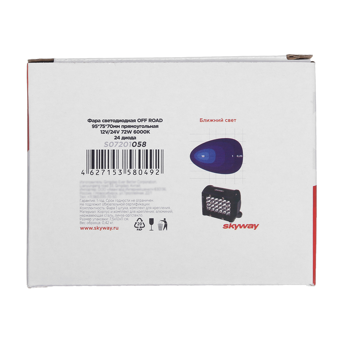 Фара светодиодная Skyway OFF ROAD, прямоугольная, 12/24 В, 72 Вт, 24 диода, 95 х 75 мм