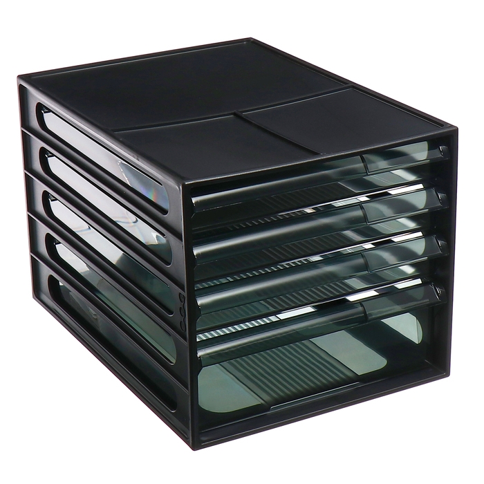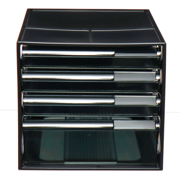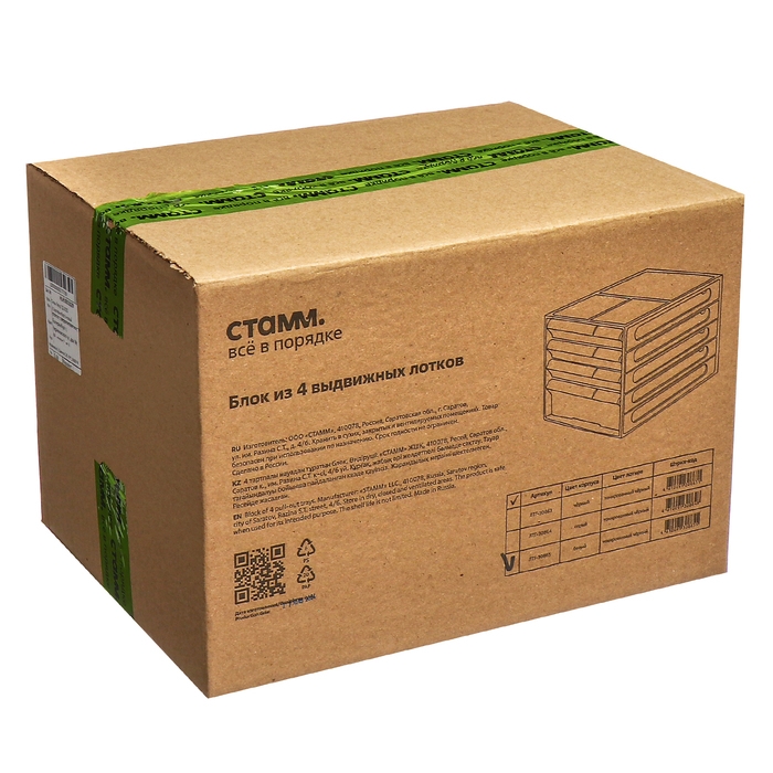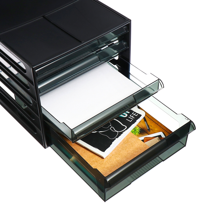 Блок из 4-х выдвижных лотков СТАММ предназначен хранения бумаг формата А4 и канцелярских принадлежностей. Габариты горизонтального блока - 230х340х250 мм. На лотках имеется ограничитель, препятствующий выпадению из корпуса. Устройчивый и прочный корпус блока выполнен из ударопрочного полистирола, лотки выполнены из полистирола. На каждом лотке предусмотрено окно для маркировки, облегчающее сортировку. Вместимость - до 1100 листов. Блок представлен в чёрном цвете, лотки выполнены в тонированном чёрном цвете. Изделие поставляется в собранном виде в картонной коробке.