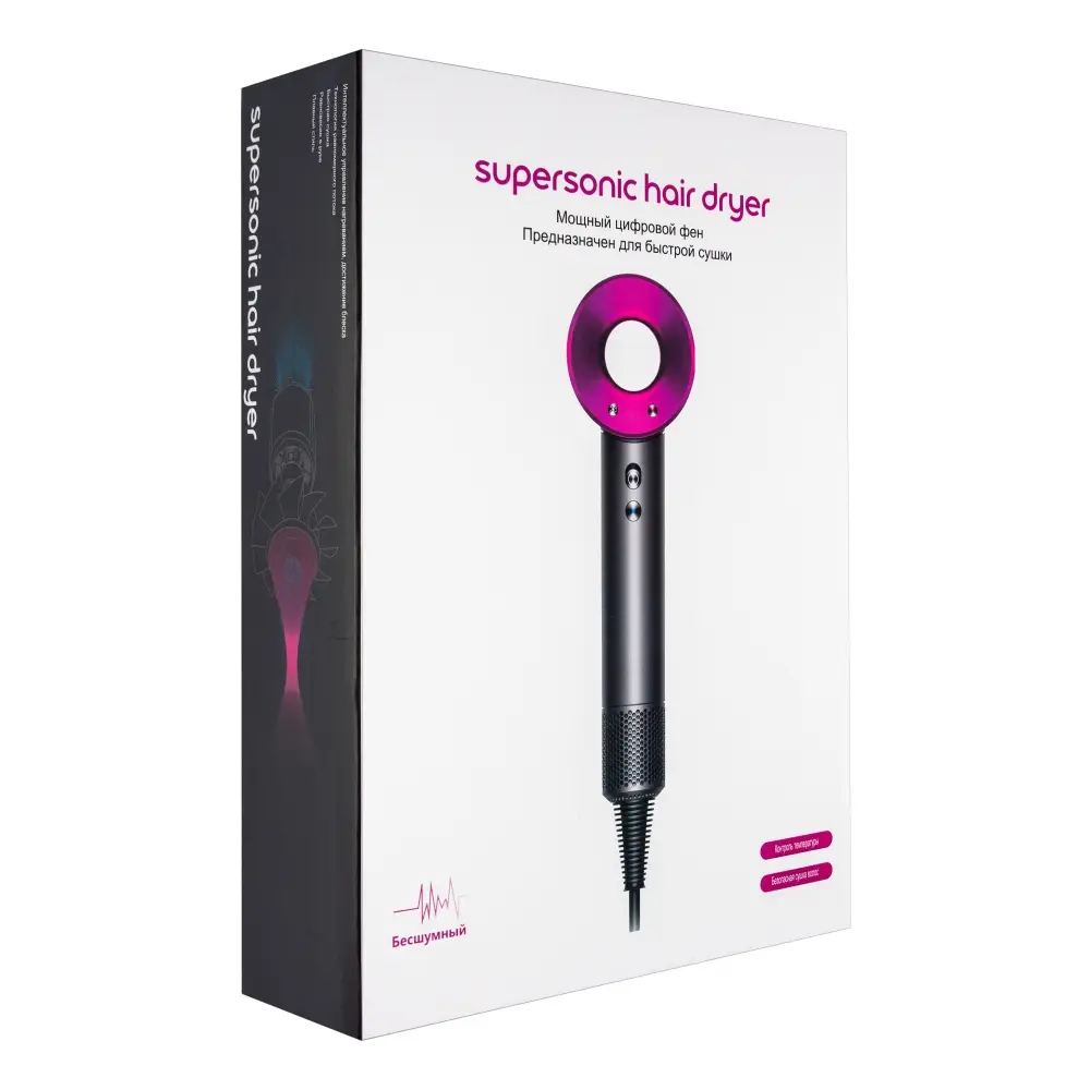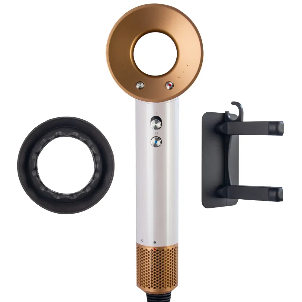 Набор фен Белый с золотом (5 в 1). Мощный профессиональный набор Supersonic Super Hair Dryer и 5 магнитных насадок предназначен для сушки и укладки волос. Данная модель стайлера имеет специальную технологию защиты волос от горячего воздуха, что позволит избежать повреждения волос и кожи головы. Фен для волос прекрасно подходит для ежедневного использования. Менять насадки очень просто благодаря магнитным основаниям, которые совершенно не нагреваются во время работы. Предусмотрено 4 температурных режима: для быстрого высушивания и укладки волос; для стандартного высушивания; для сушки при более низкой температуре и разделении; для высушивания холодным воздухом. Функция ионизации, диффузор для завивки и насадка выпрямления выпрямитель расческа. Максимальная мощность - 1350 Вт. Трехуровневая регулировка температуры ( 60/80/100 градусов ) и скорости. Есть функция 'Холодный обдув' ( Нажмите и удерживайте для отключения тепла ). Кнопка данной функции находится под переключателем ВКЛ/ВЫКЛ. Так же в данном товаре присутствует фильтрация воздуха для защиты вашего дыхания во время сушки. Рекомендуется периодически чистить фильтр от пыли ( находится в нижней части фена ). Длина сетевого шнура - 3 метра. Количество насадок - 4шт.