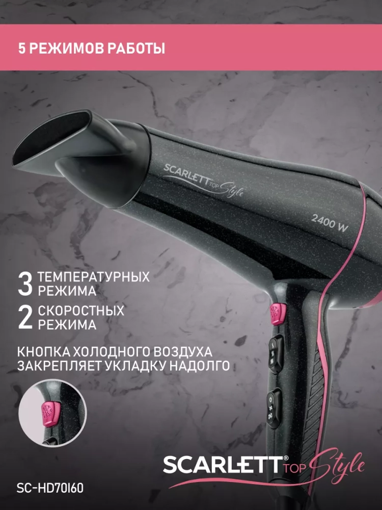 Мощный и стильный фен с функцией ионизации и сменными температурными режимами. Мотор 2400 Вт обеспечит быструю сушку, а профессиональная насадка-концентратор подходит для профессиональной и точной укладки. Прибор оснащен 2 режимами мощности потока воздуха, 3 режимами температуры воздуха для бережной и быстрой сушки любого типа волос. Также фен имеет режим холодного воздуха для фиксации прически. Мы позаботились о том, чтобы ваши волосы приобрели максимальный блеск и сияние, без пересушивания, благодаря технологии Advanced Tourmaline. Эргономичная форма ручки предотвращает скольжение прибора во время сушки.