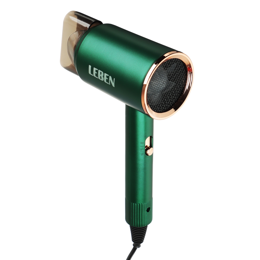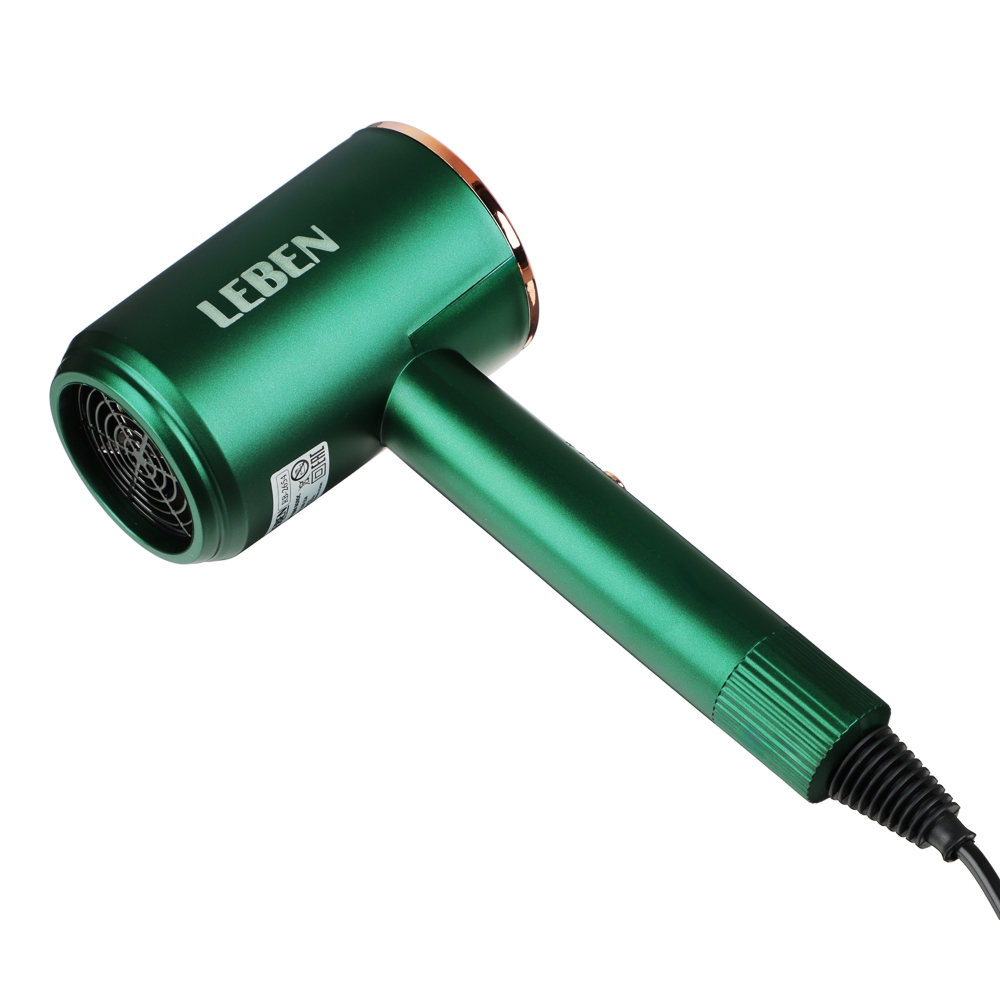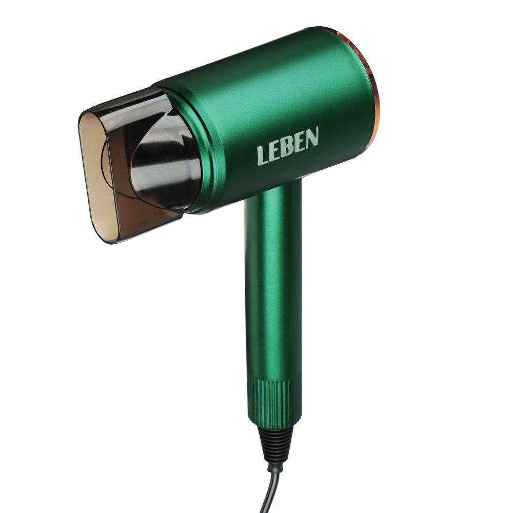 LEBEN Фен для волос имеет мощность 900 Вт и две скорости обдува. Он предлагает три температурных режима и работает от сети 220-240 В. Фен оснащен насадкой-концентратором и имеет два скоростных режима. Зеленый цвет фена делает его стильным и универсальным аксессуаром для ухода за волосами.