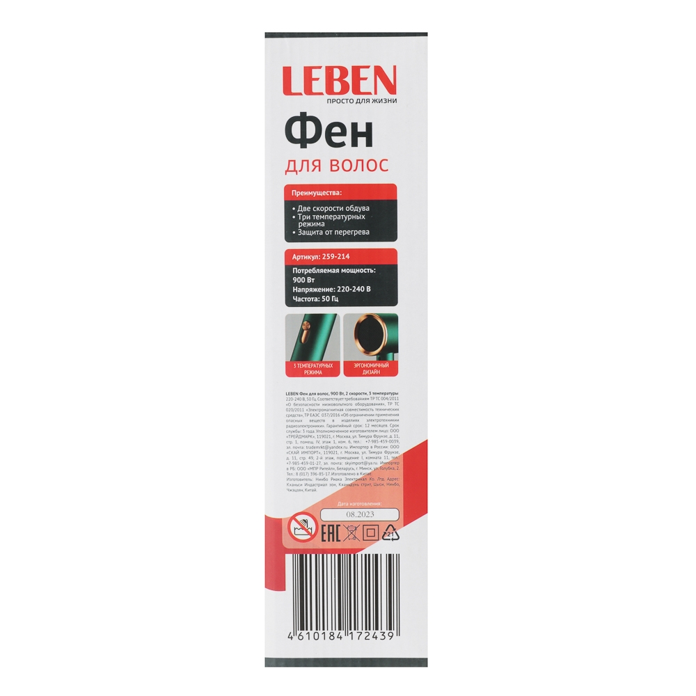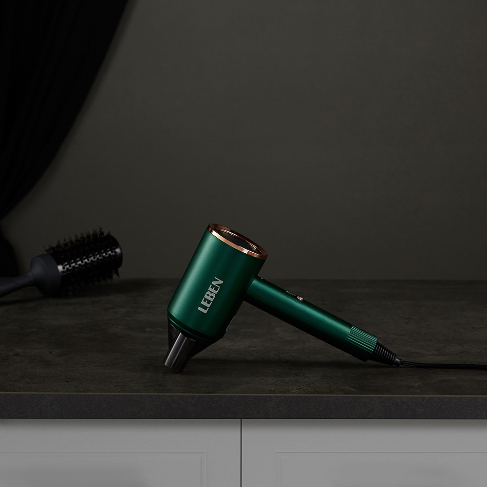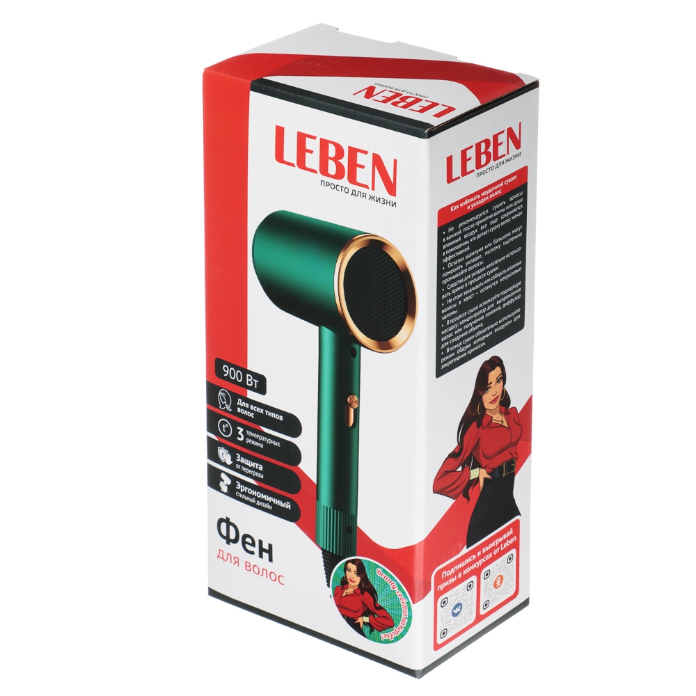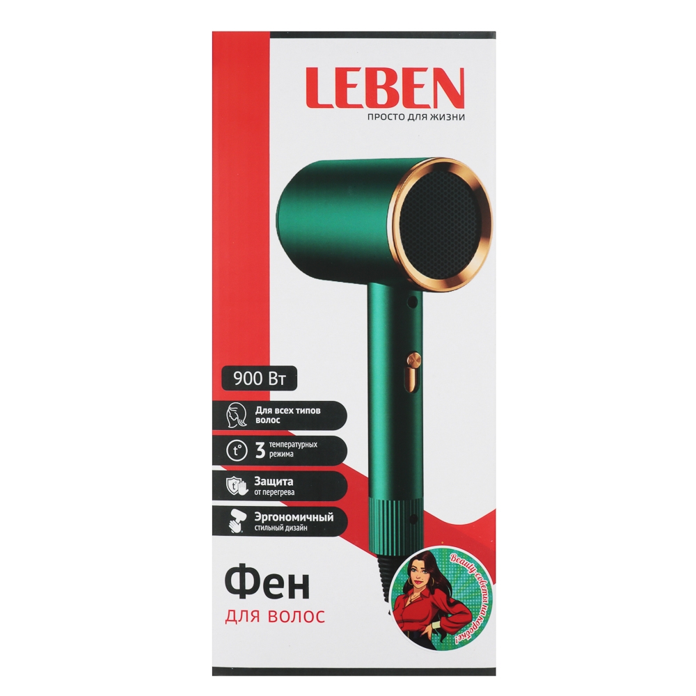 LEBEN Фен для волос имеет мощность 900 Вт и две скорости обдува. Он предлагает три температурных режима и работает от сети 220-240 В. Фен оснащен насадкой-концентратором и имеет два скоростных режима. Зеленый цвет фена делает его стильным и универсальным аксессуаром для ухода за волосами.