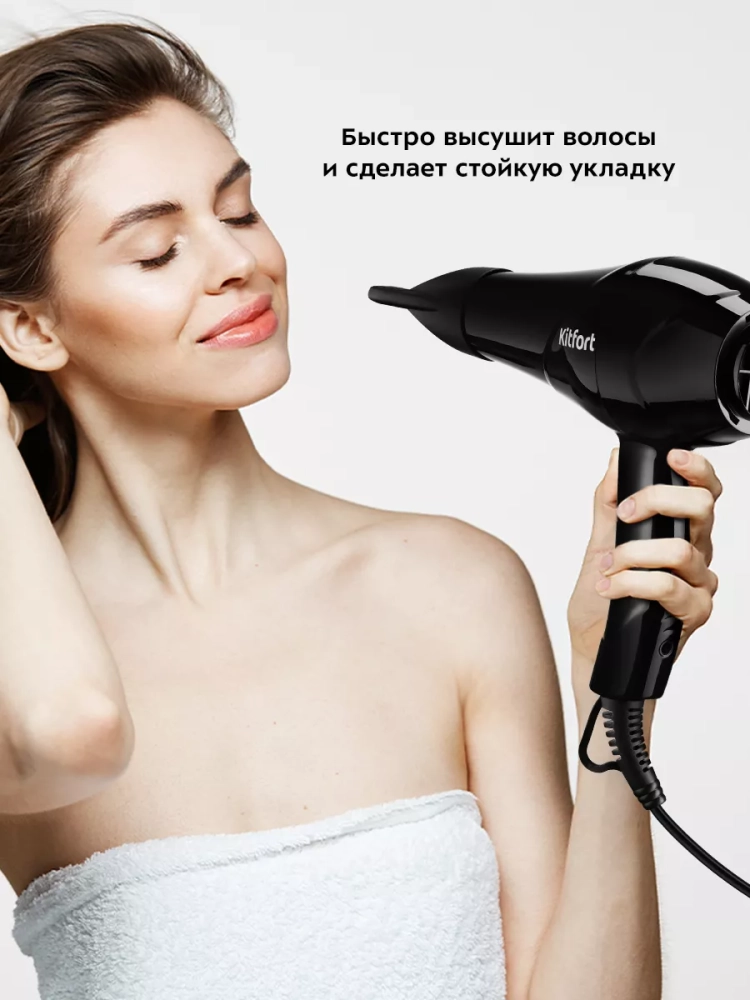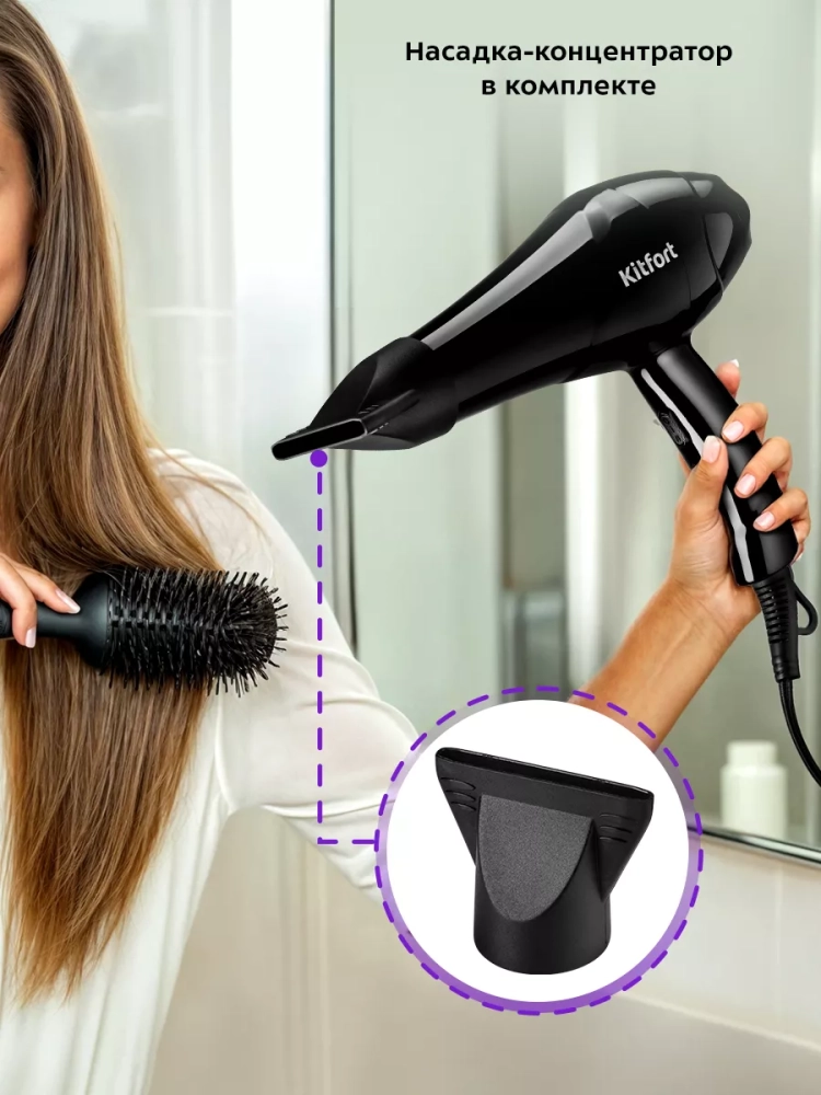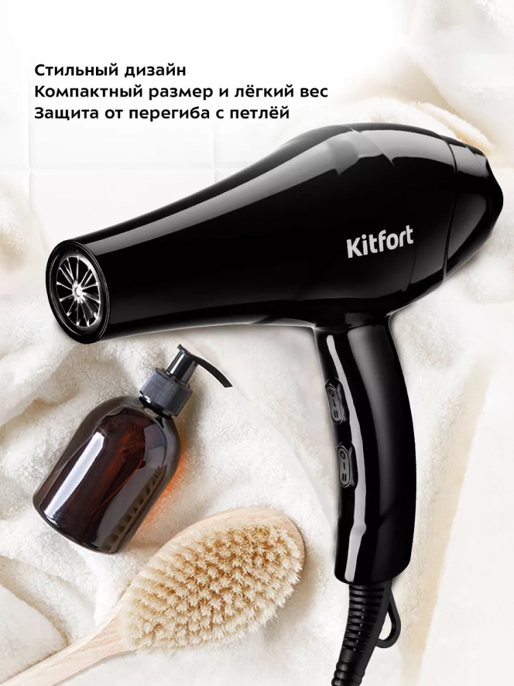 Фен Kitfort КТ-3204 поможет быстро высушить волосы и сделать укладку. У прибора две скорости работы и три температурных режима. Управление осуществляется с помощью двух переключателей: переключатель включения и выбора скорости, а также переключатель температуры, который служит для включения холодного, теплого или горячего воздуха.