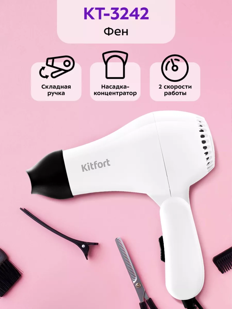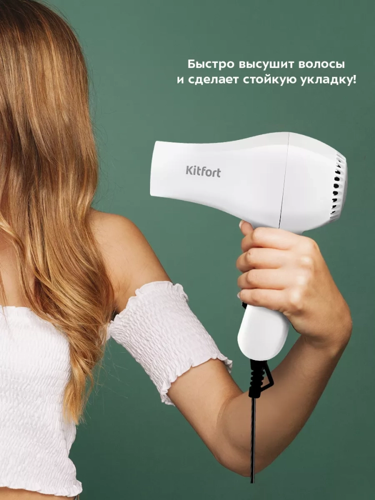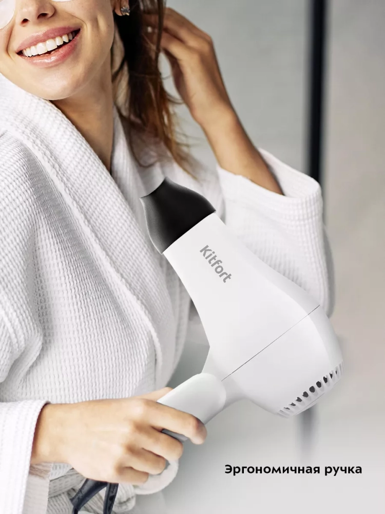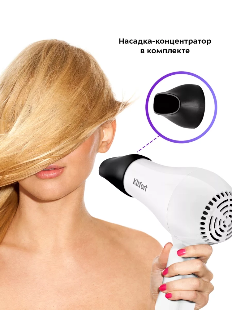 С помощью фена Kitfort КТ-3242 вы сможете быстро высушить волосы и сделать красивую укладку. Фен выдает направленный поток воздуха, поэтому волосы с ним сушить просто и удобно.