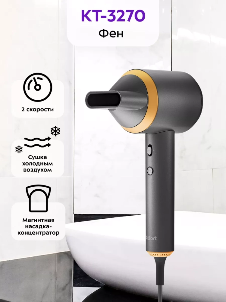 С помощью фена Kitfort КТ-3270 вы сможете быстро высушить волосы и сделать красивую укладку. Фен выдает направленный поток воздуха, поэтому волосы с ним сушить просто и удобно.