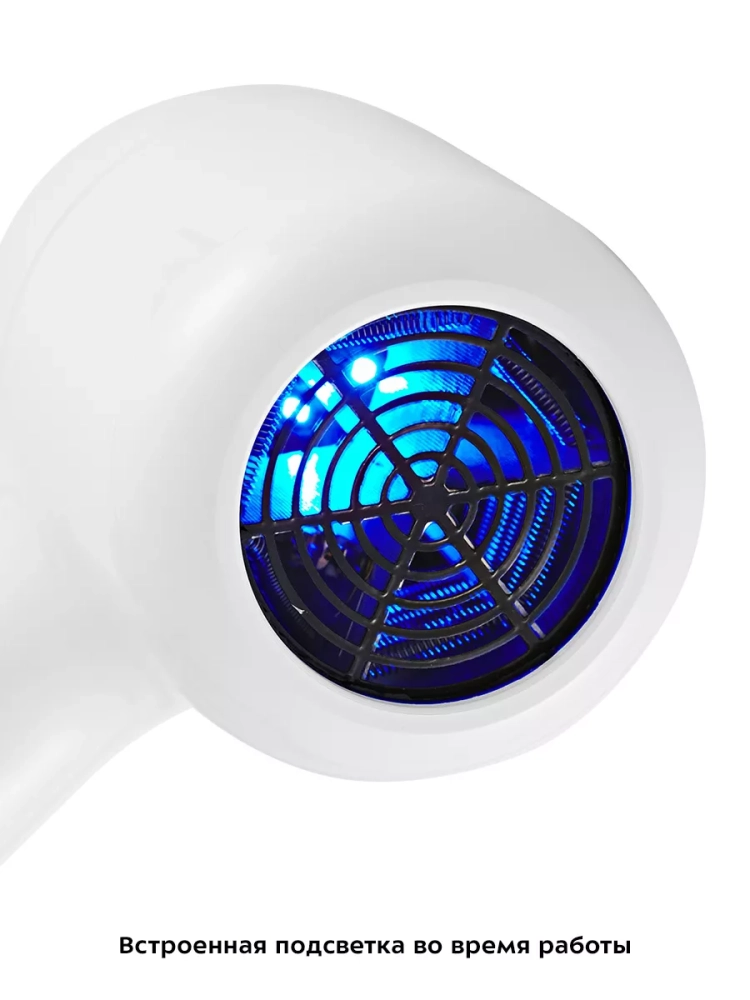 В сопло фена встроена подсветка, которая горит непрерывно во время работы. Шнур фена оснащен защитой от перегиба, что увеличивает срок службы прибора. В ручке фена есть отверстие, чтобы его можно было повесить на крючок.
