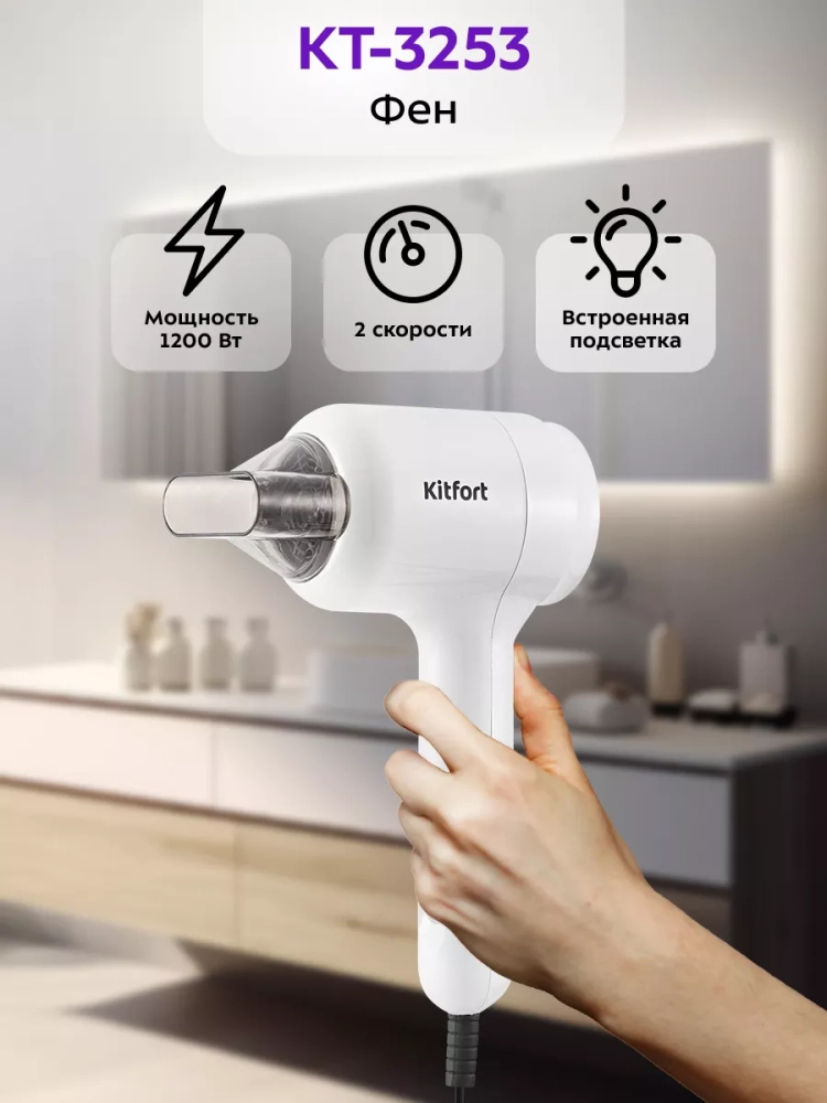 Фен Китфорт КТ-3253 легкий, эргономичная ручка удобно лежит в руке. Благодаря небольшому весу и компактному корпусу фен не занимает много места при хранении, его удобно брать с собой в поездки, путешествия или рабочие командировки.