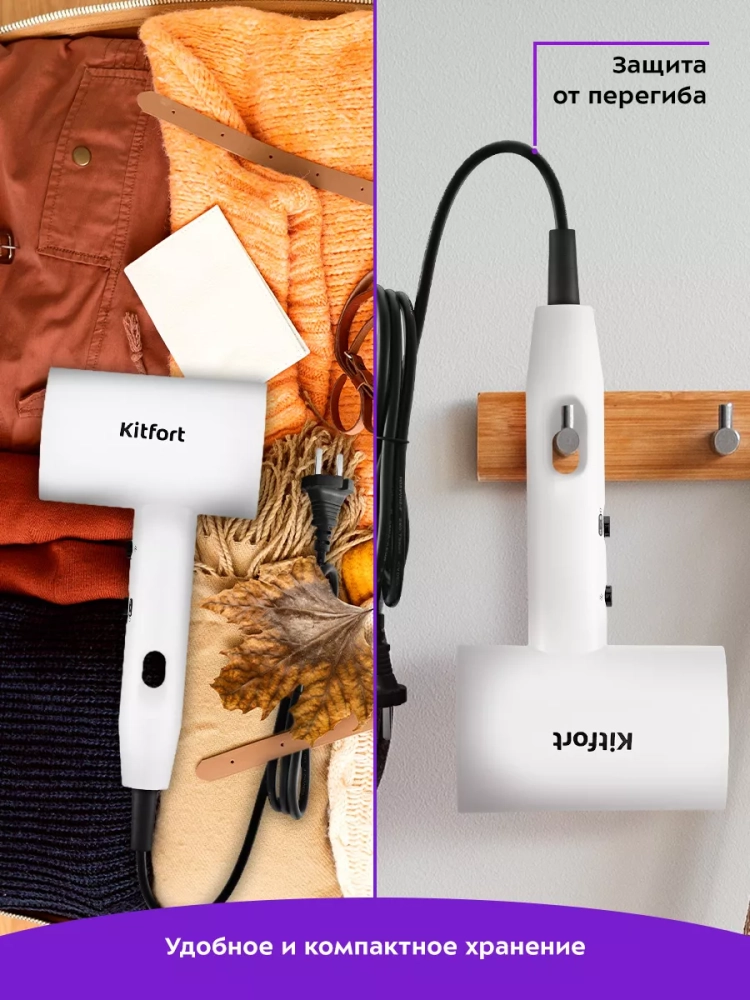 Фен Китфорт КТ-3255 легкий, эргономичная ручка удобно лежит в руке. Благодаря небольшому весу и компактному корпусу фен не занимает много места при хранении, его удобно брать с собой в поездки, путешествия или рабочие командировки.