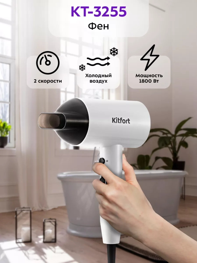 С помощью фена Kitfort КТ-3255 вы сможете быстро высушить волосы. Благодаря насадке-концентратору, которая вращается на 360°, поток воздуха можно направить под нужным углом, чтобы легко и быстро сделать укладку.