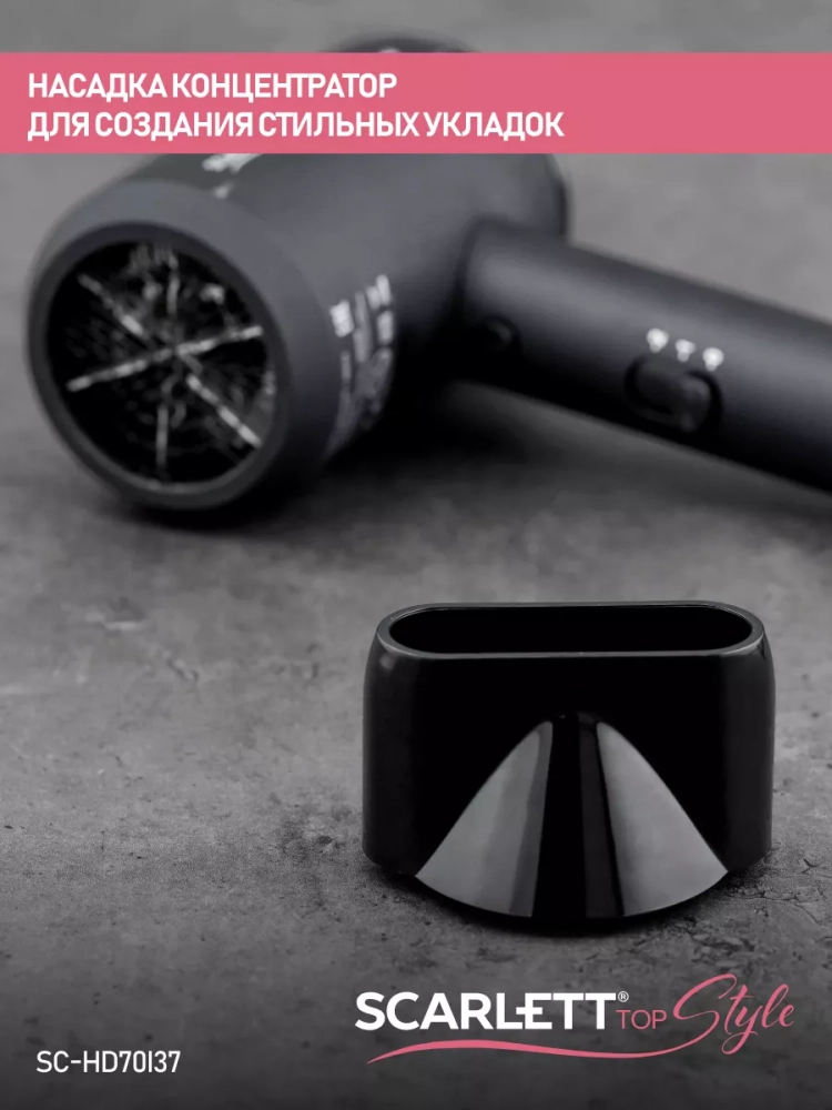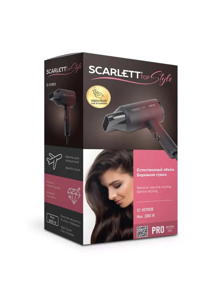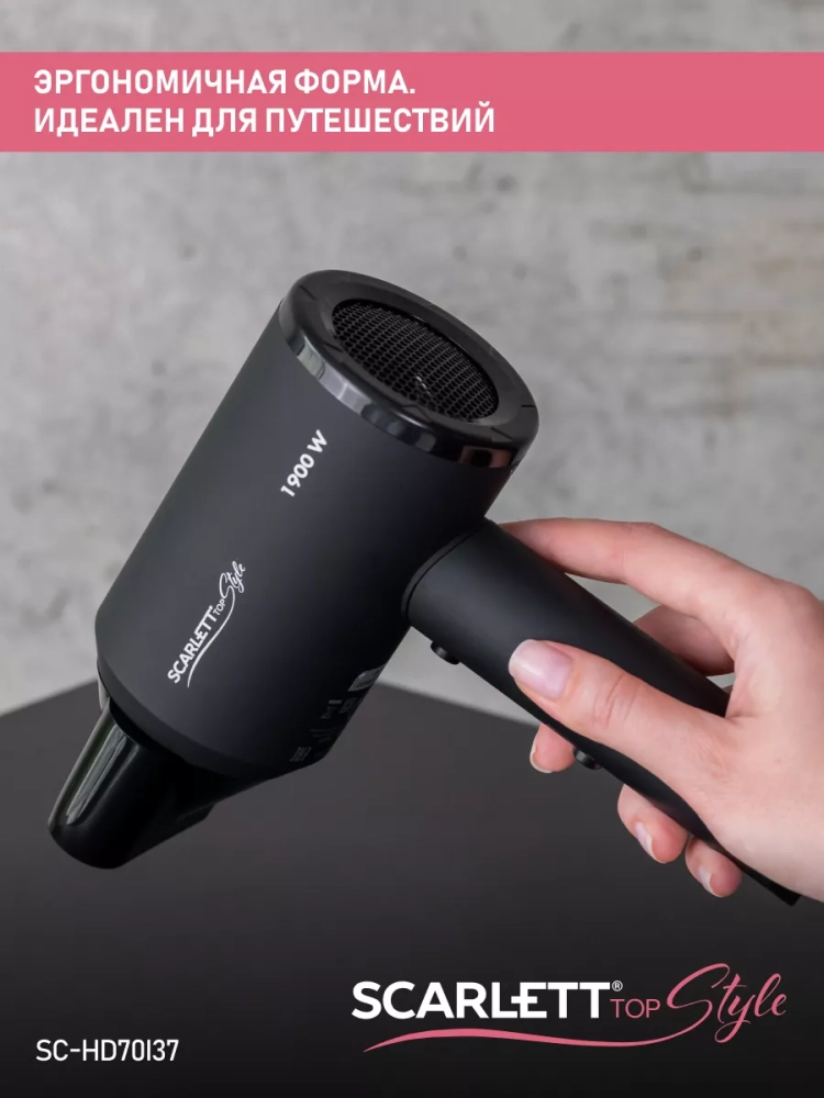 Фен SC-HD70I37 - это новое универсальное решение Scarlett Top Style. Продукт обладает достаточно мощным мотором 1900 Вт, но и удобен в хранении благодаря компактным размерам. Он не займет много места даже в небольшой ванне или вашем чемодане, пока вы путешествуете. Модель имеет сменные температурные режимы для бережной и быстрой сушки любого типа волос, а также кнопку подачи холодного воздуха для фиксации укладки.