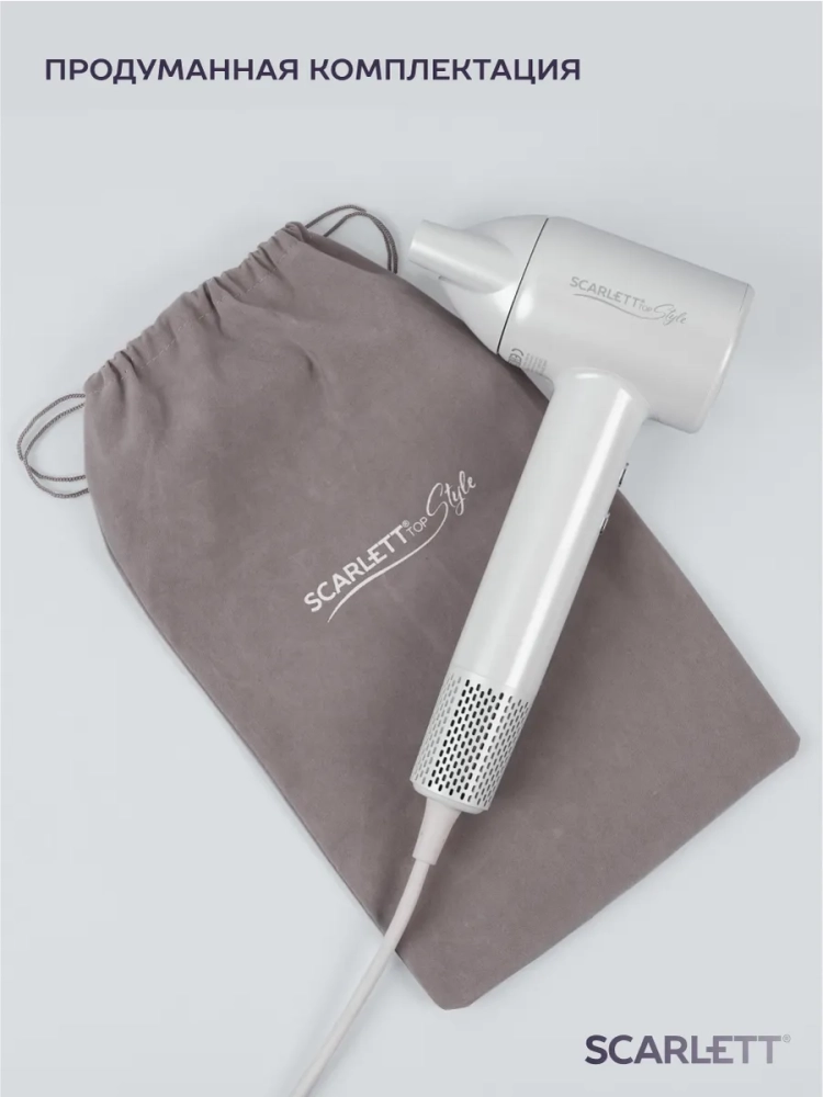 Фен комплектуется чехлом для хранения, который защищает прибор от пыли и механических повреждений, тем самым продлевая его срок службы.