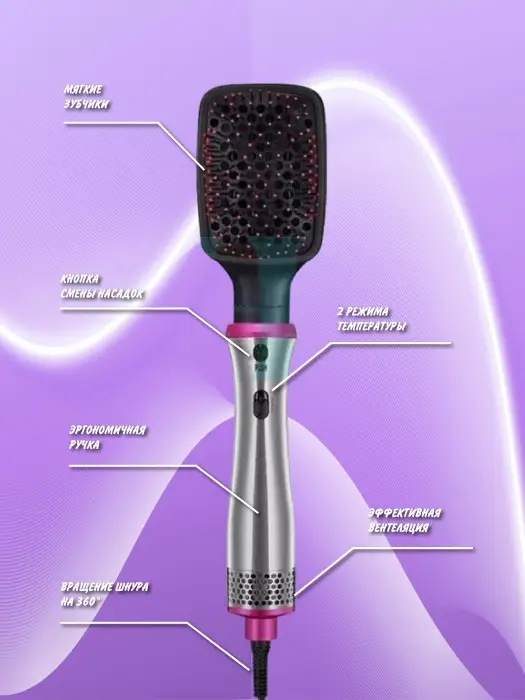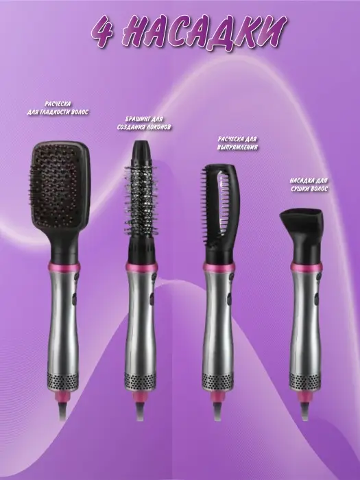 Фен-расческа для волос представляет собой многофункциональный прибор, который поможет сделать прическу на любой вкус. Мультистайлер является незаменимым средством для ухода за волосами каждой современной девушки. Фен для волос, профессиональный персональный уход, 4 в 1, щетка для горячего воздуха, 2 температурных режима. Насадки: Расческа для сушки волос: Расчесывает волосы и завивает волосы текстурой спины. Гребень для вьющихся волос: создает длинные вьющиеся волосы, не причиняя вреда волосам. Гребень квадратный: Гребень для больших расчесок сушит гладкие волосы и укладывает волосы. Рот сборщика воздуха: сушит волосы и сохраняет пушистые волосы . Особенности: Керамическое покрытие создает прямые, гладкие и блестящие волосы; Во время сушки выделяется большое количество отрицательных ионов, что нейтрализует электрический заряд волос, убирает статическое электричество; Эффективно и бережно ухаживает за волосами. Максимальная температура зубьев гребня не превышает 50. Легкий в использовании. Салонная укладка теперь доступна у вас дома; Двойная защита от перегрева, автоматически прекратит работу при нагревании.