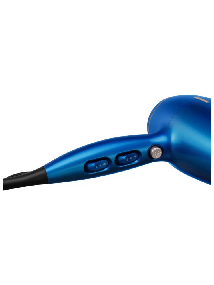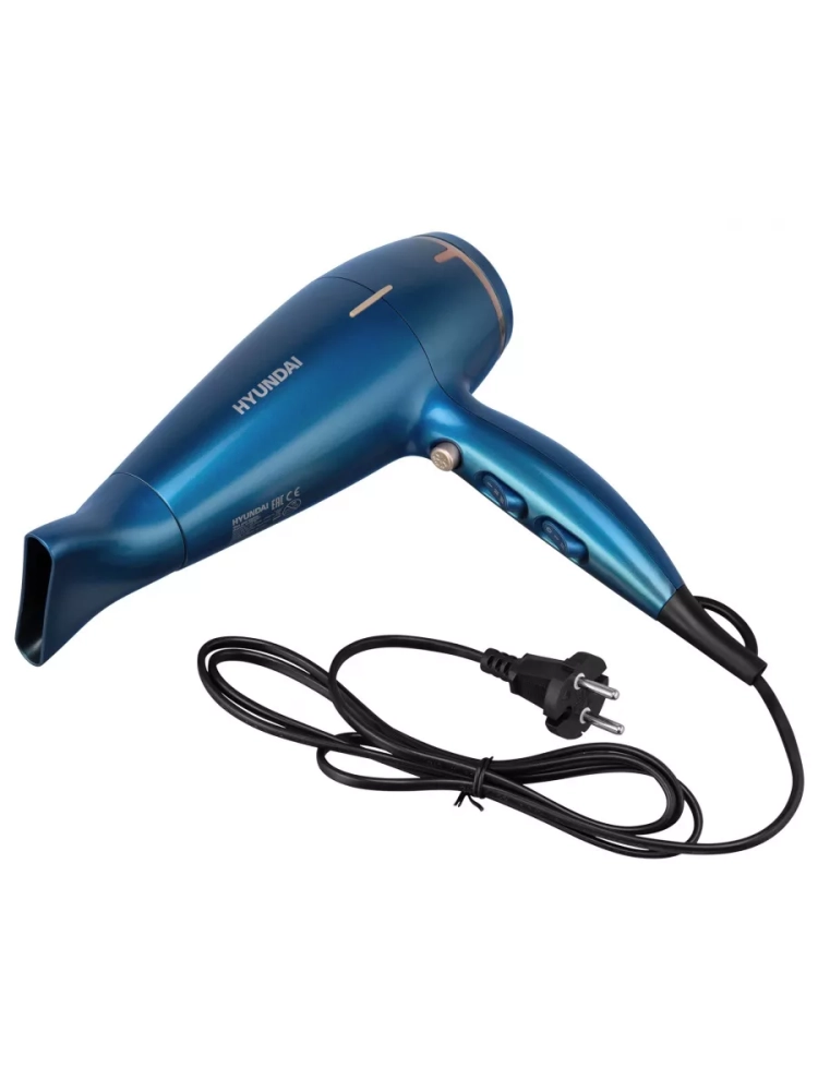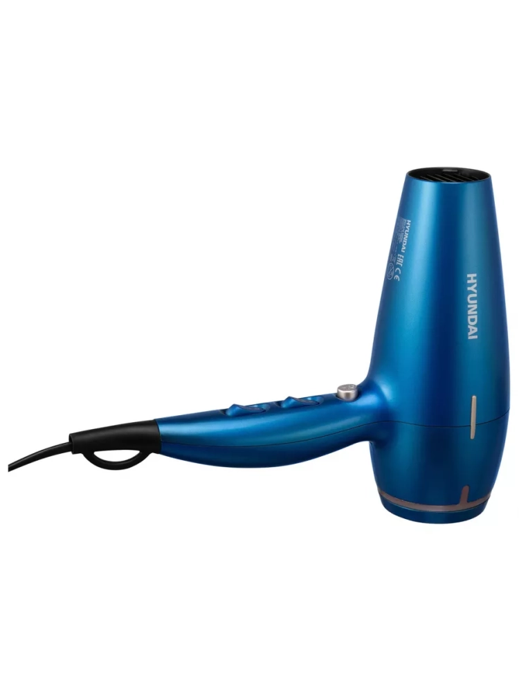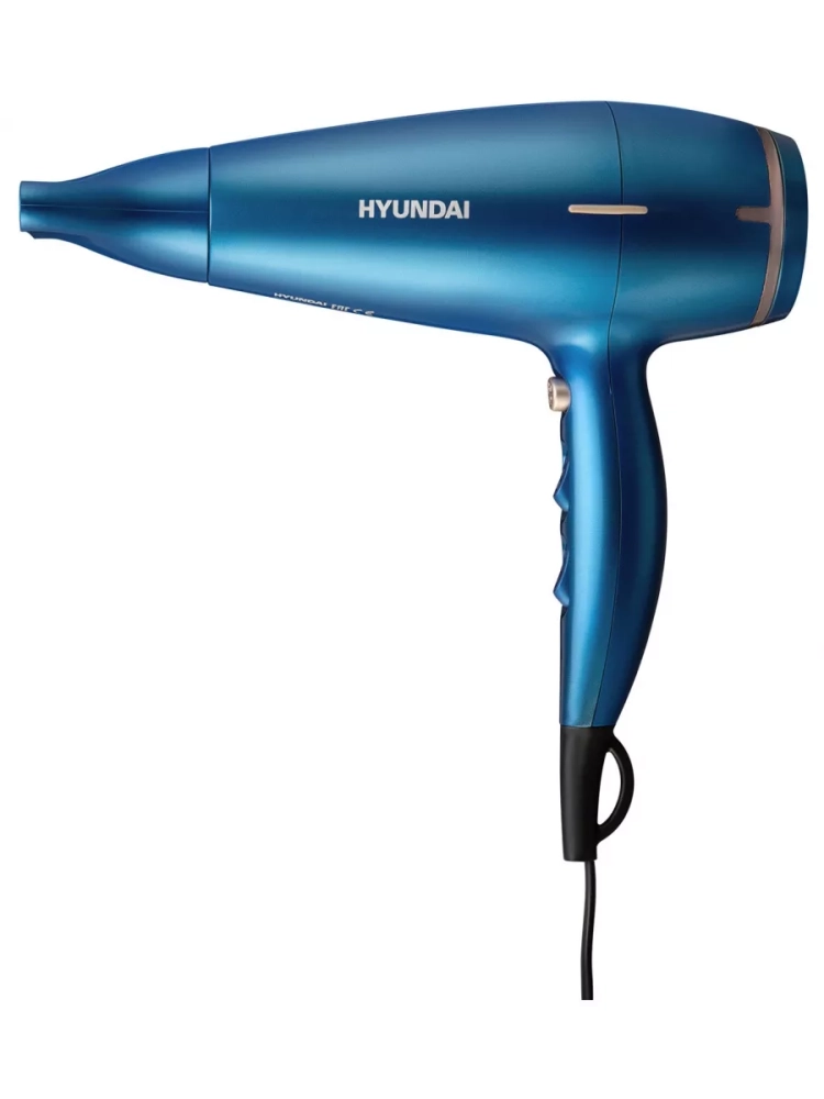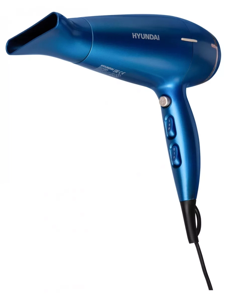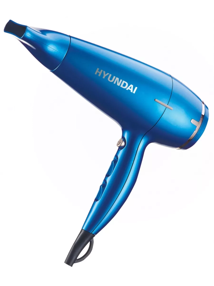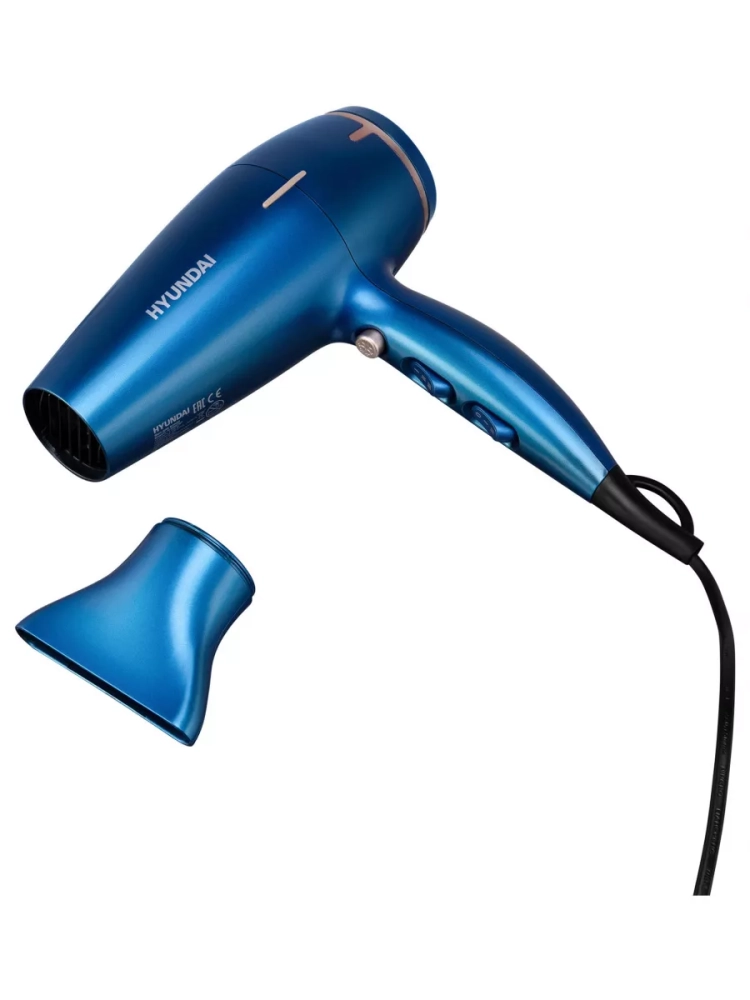 Фен Hyundai H-HDI0757 синий, мощность 2200Вт, насадок 1шт. Независимая система управления; Диаметр для насадки = 49 мм; Макс.темп.нагрева = 116 С. Съемная защитная решетка