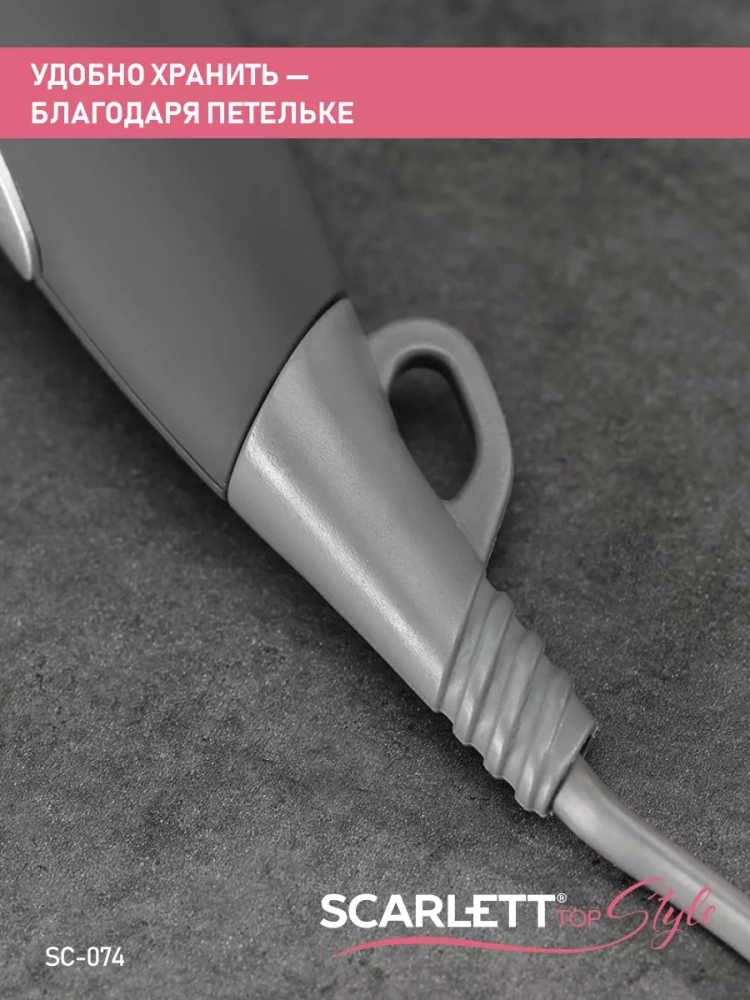Фен Scarlett TOP STYLE SC-074, выполненный в нежных тонах, станет лучшим решением для всевозможных поездок - благодаря складной ручке он почти не занимает места в чемодане