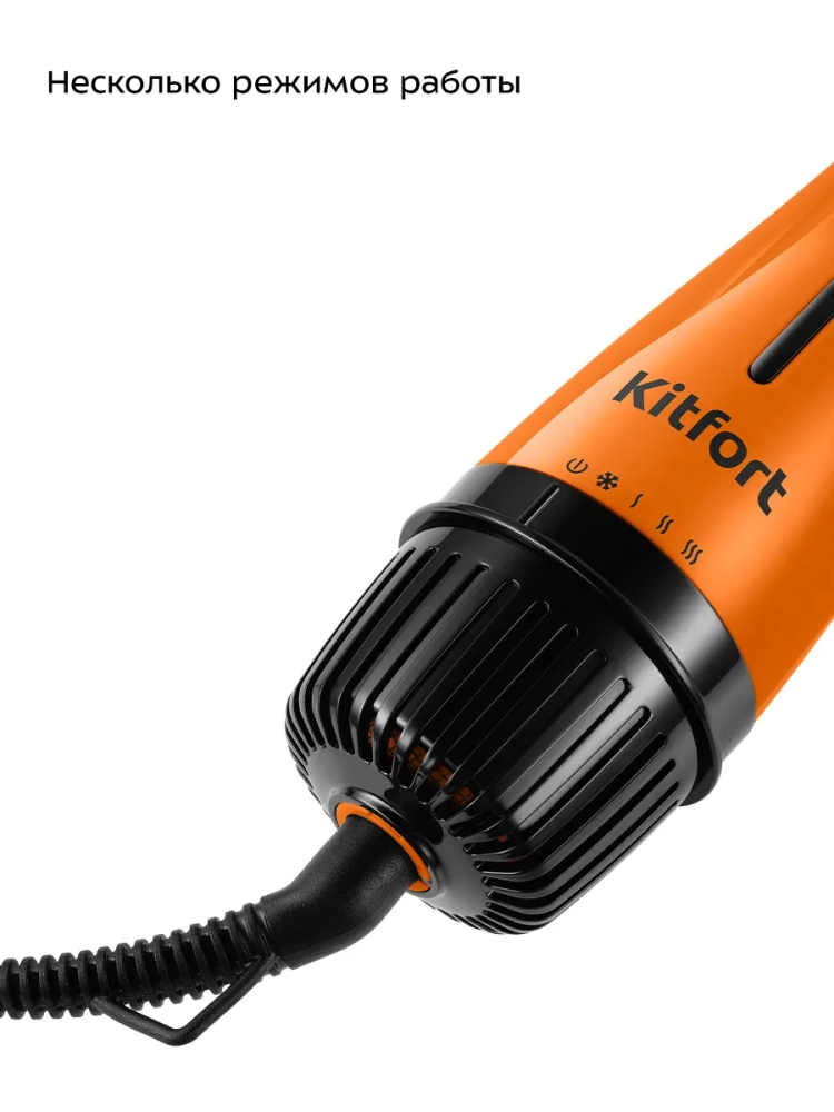 Для удобства использования фен-щетка КТ-3287 имеет 2 скорости работы и 3 температурных режима. У переключателя скорости и температуры всего 5 положений — фен-щетка выключен, холодный воздух, низкая скорость и теплый воздух, высокая скорость и теплый воздух, высокая скорость и горячий воздух.