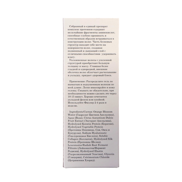 Состав: Orange Blossom Water (Гидролат Цветков Апельсина), Aqua (Вода), Sodium Hyaluronate (Гиалуроновая Кислота), Glycerin (Глицерин), Citrus Aurantium Dulcis Fruit Extract (Экстракт Апельсина), Hydrolyzed Keratin Protein (Кератин), Hydrolyzed Vegetable Protein (Протеины Пшеницы, Сои, Овса и Кукурузы), Soluble Collagen (Коллаген), Hydrolyzed Silk Protein (Протеины Шелка), Leuconostoc/Radish Root Ferment Filtrate (Лейконосток/Фермент Редиски), Hydrolyzed Elastin (Гидролизованный Эластин), Cetrimonium Chloride (Цетримония Хлорид)..