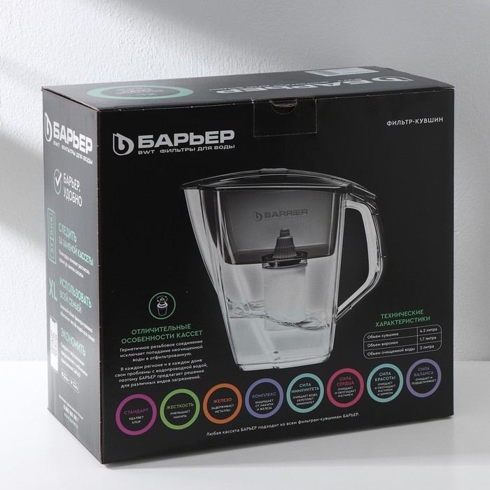 Фильтр укомплектован сменной фильтрующей кассетой «БАРЬЕР-4». В состав кассеты входят особая комбинация высококачественных активированных углей для сорбции вредных примесей и специальные ионообменные материалы для удаления из воды ионов токсичных металлов.
