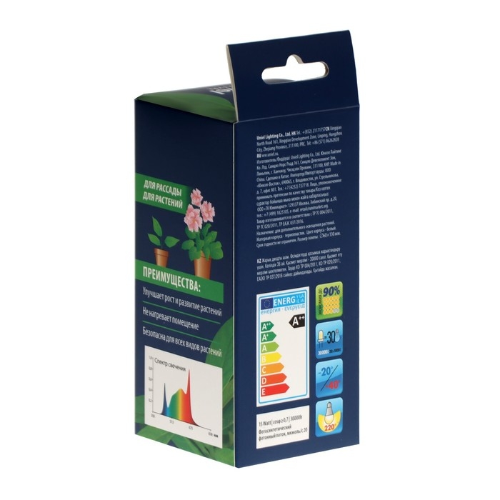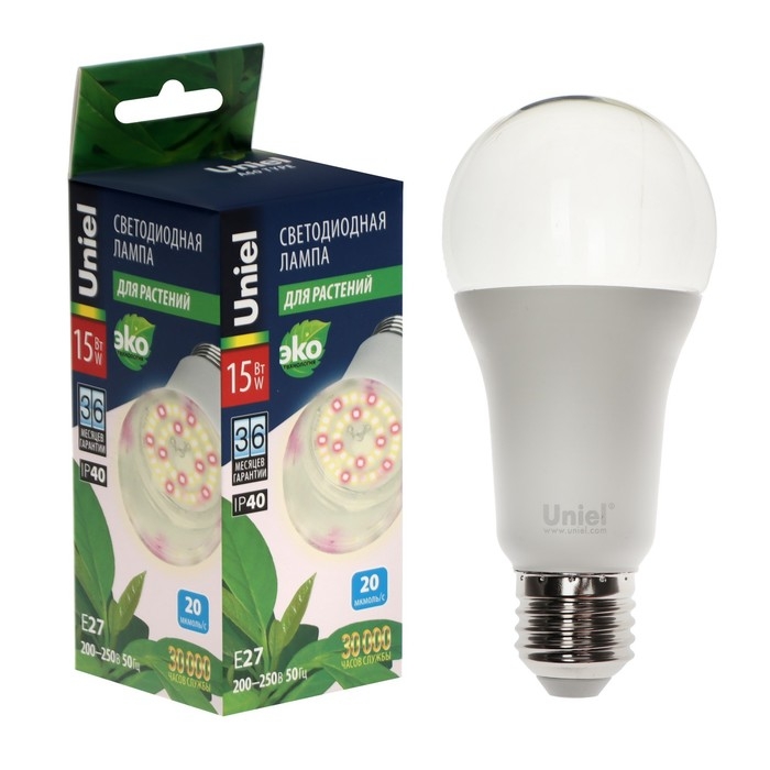 Фитолампа светодиодная Uniel, А60, Е27, 15 Вт, 250 В, 220°, спектр для фотосинтеза