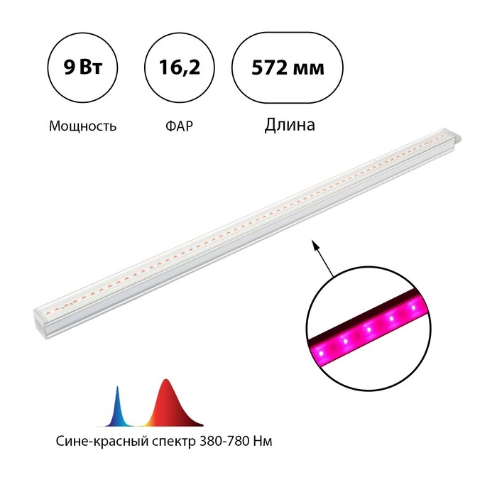 Фитосветильник светодиодный, 9 Вт, 572 мм, сине-красный спектр, фиолетовый, FITO-9W-Т5-N, «ЭРА»