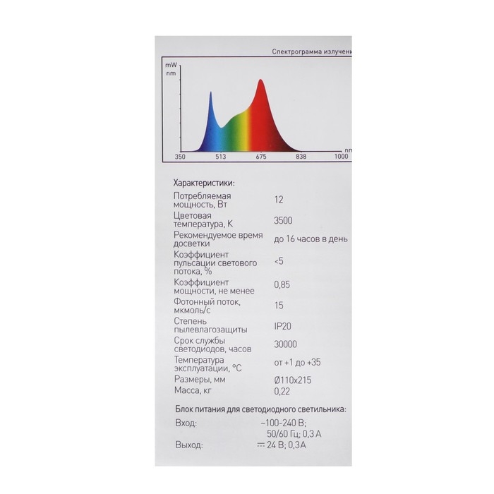 Фитосветильник светодиодный ЭРА, 12 Вт, IP20, 110х110х215 мм, штыковой, полный спектр
