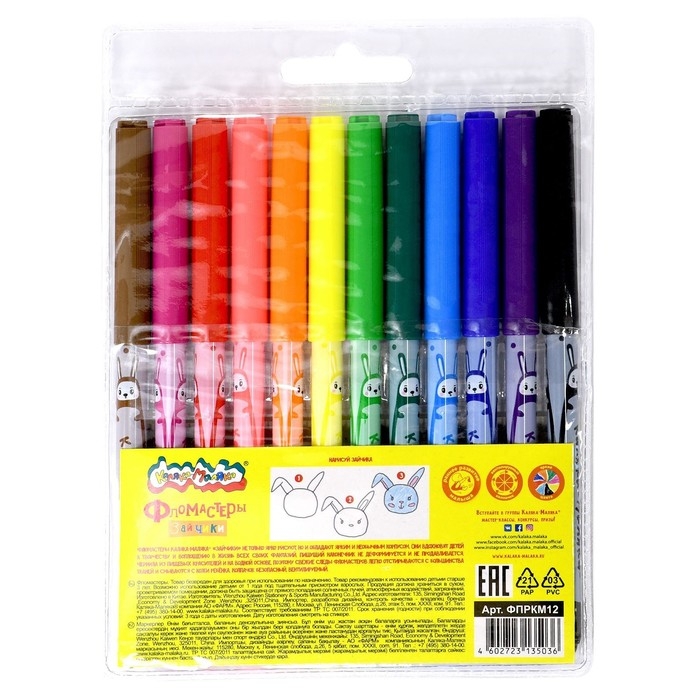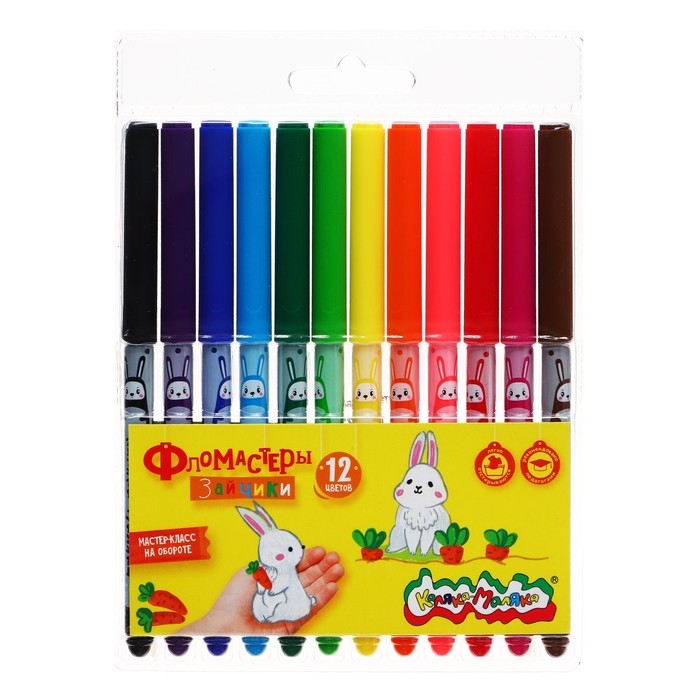 Фломастеры 12 цветов классические "ЗАЙЧИКИ" Каляка-Маляка, круглый корпус с принтом, блистер, 3+