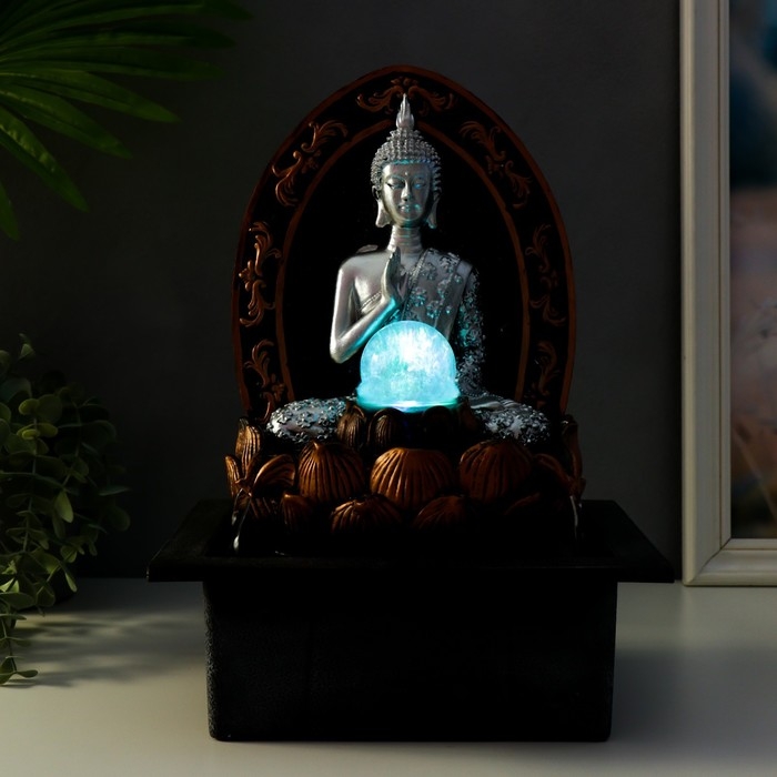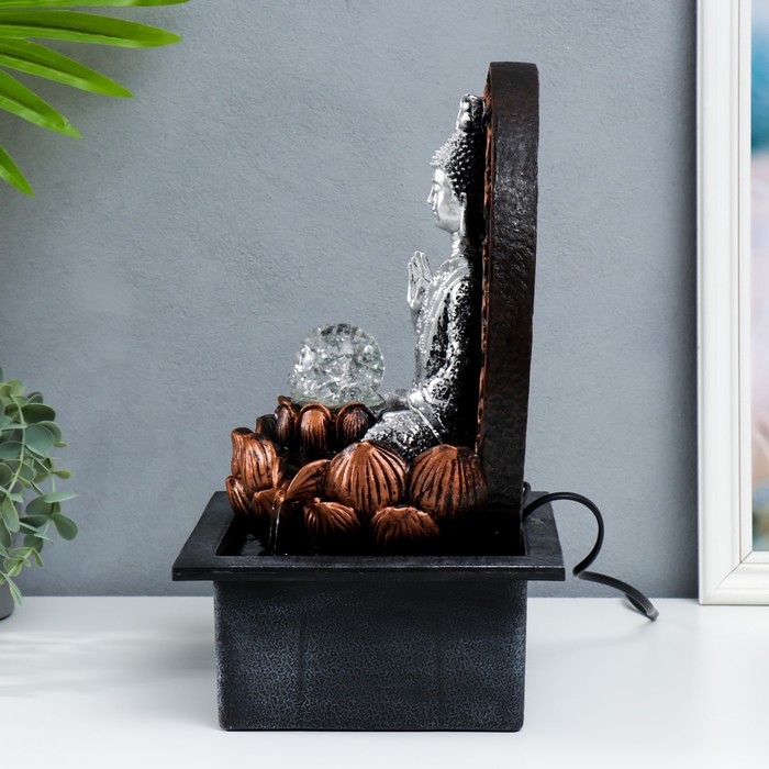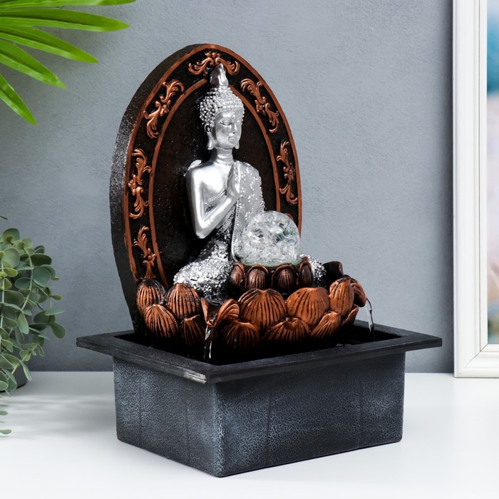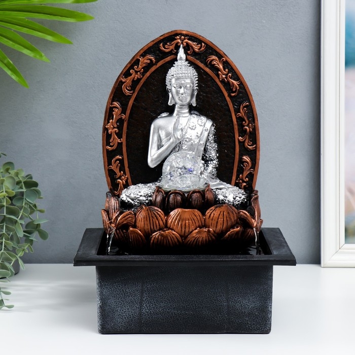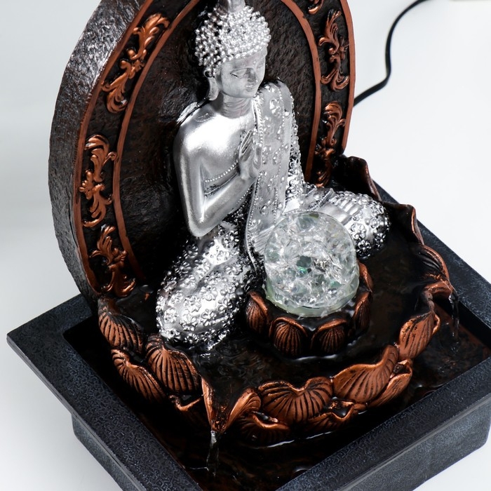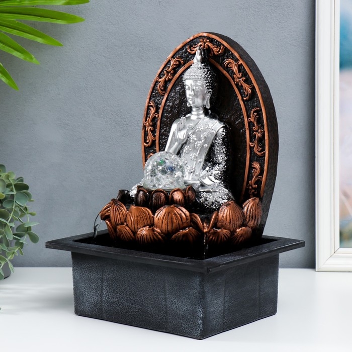 Фонтан настольный от сети, подсветка "Будда в арке у лотоса" серебро 35х25х20 см
