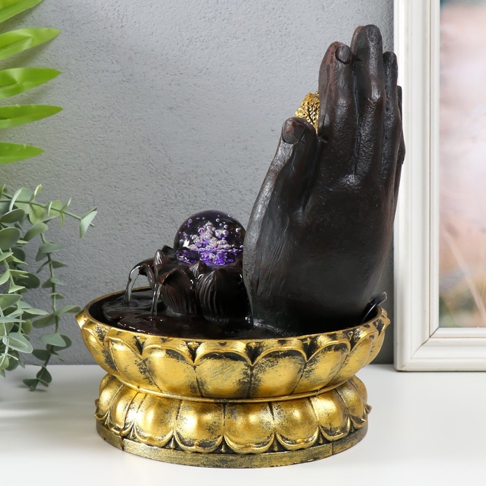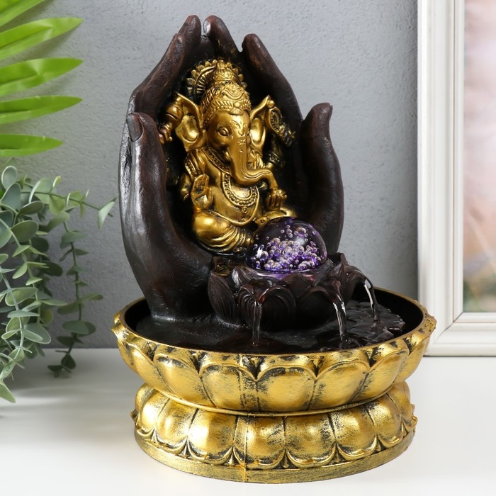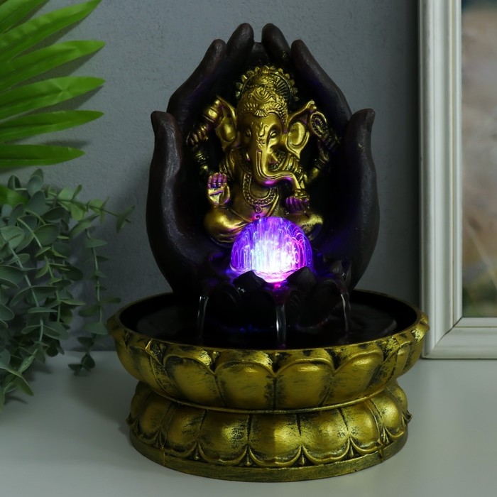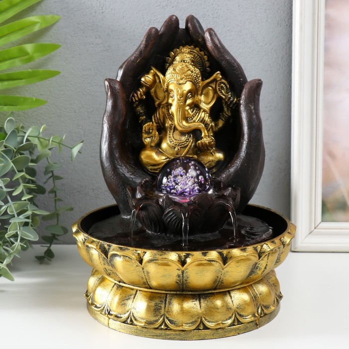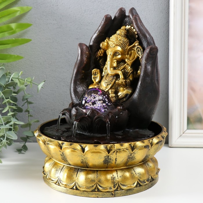Фонтан настольный от сети, подсветка "Золотой Ганеша в ладонях" 21х21х28 см
