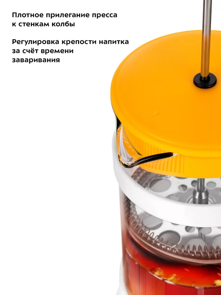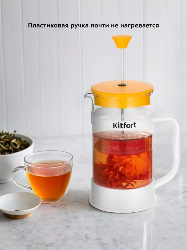 Френч-пресс Kitfort KT-1254 предназначен для приготовления кофе или чая иммерсионным способом, при котором чайные листья или молотый кофе заливают горячей водой и заваривают в колбе в течение нескольких минут, а затем прижимают сверху прессом. Пресс опускается с помощью плунжера и состоит из двух прижимных пластин и фильтра, который представляет собой металлическое ситечко. За счет времени заваривания вы можете регулировать крепость напитка: чем дольше экстракция, тем крепче кофе или чай. На крепость напитка также влияет давление пресса, который утрамбовывает кофейную гущу или чайную заварку на дне колбы. В крышке колбы есть дополнительный фильтр в виде пластиковой решетки.