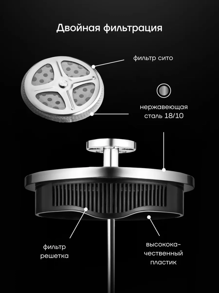 Металлический сетчатый фильтр гарантирует эффективную фильтрацию напитков, что позволяет использовать мелко измельченные ингредиенты при заваривании. Прочное ситечко легко чистится и остается в идеальном состоянии на протяжении долгого времени. Ручка из жаропрочного стекла не нагревается и обеспечивает надёжную хватку и безопасность во время использования. Крышка выполнена из высококачественного пластика, который устойчив к царапинам, что обеспечивает долгий срок службы и привлекательный внешний вид. Удобный носик предотвращает проливание напитков на стол, гарантируя безопасное наливание.