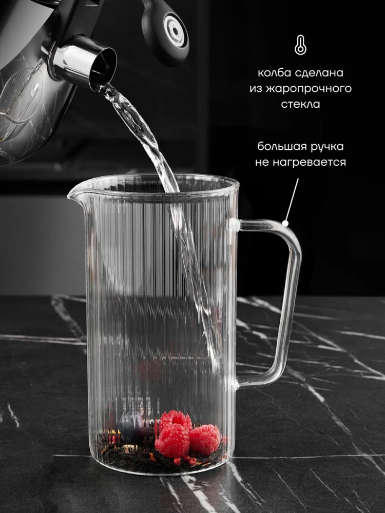 Прозрачный заварочный чайник из жаропрочного материала позволяет долго сохранять напитки горячими. Благодаря этому, чайные листья полностью раскрывают свой аромат, а кофейные зерна могут как следует настояться.