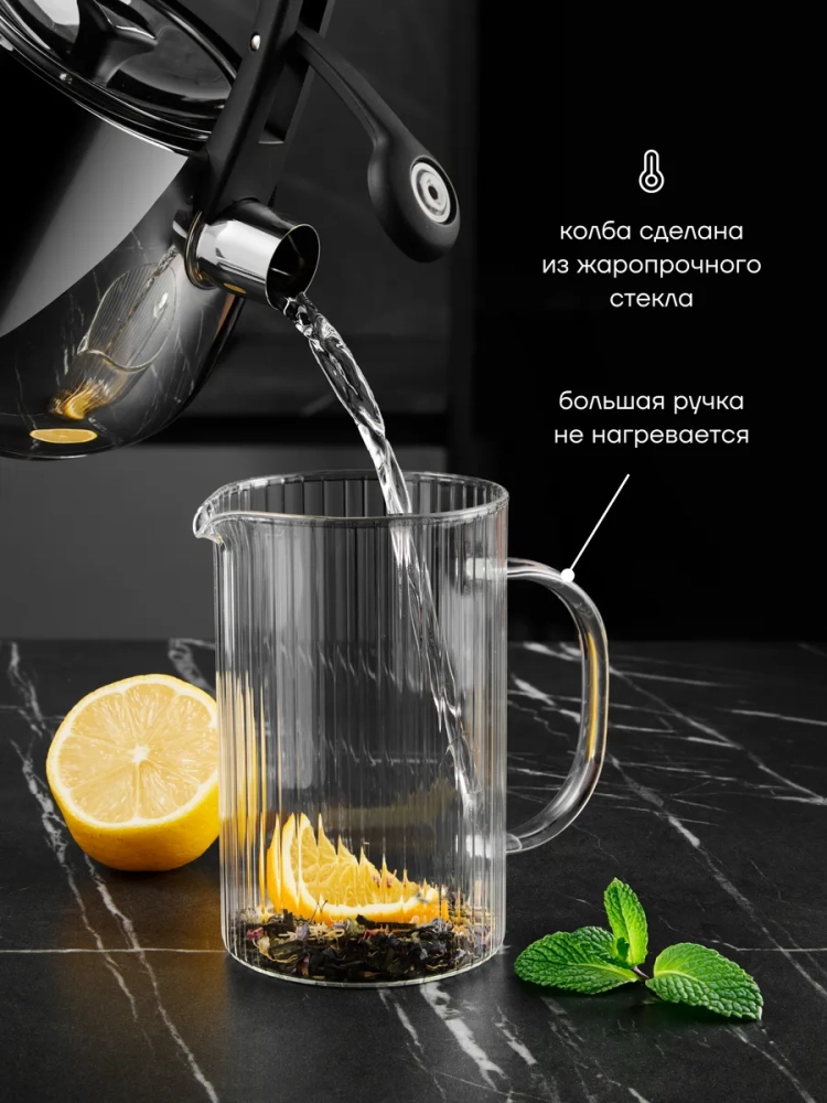Изготовленный из жаропрочного материала, прозрачный заварочный чайник обеспечивает длительное сохранение тепла, что позволяет чайным листьям полностью раскрыть свой аромат и кофейным зернам — максимально настояться.