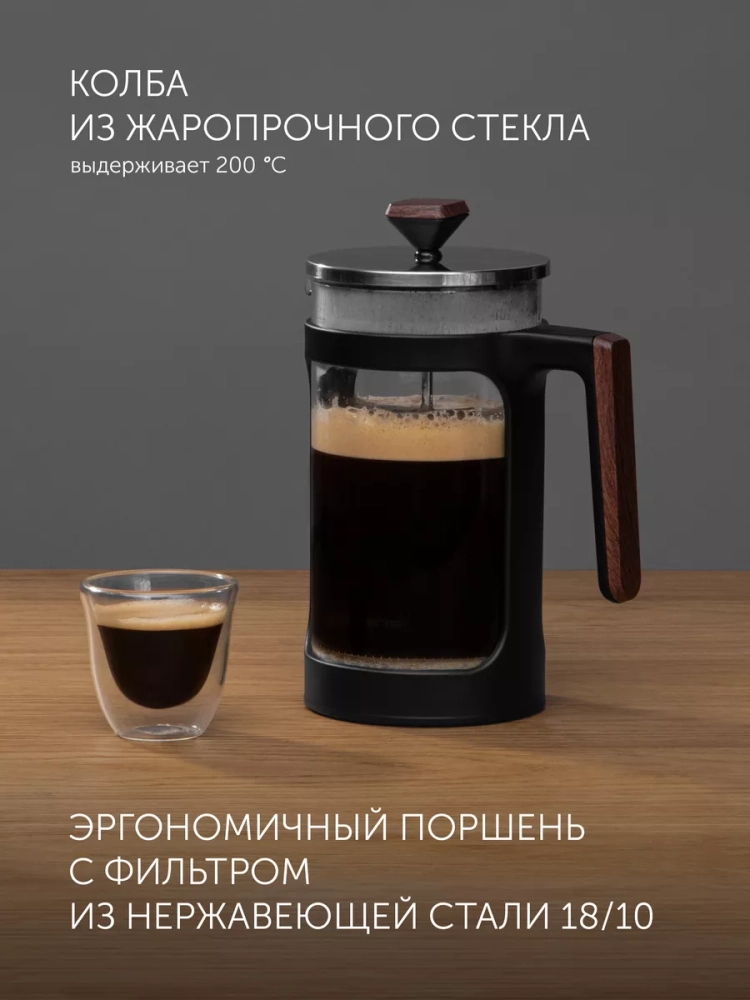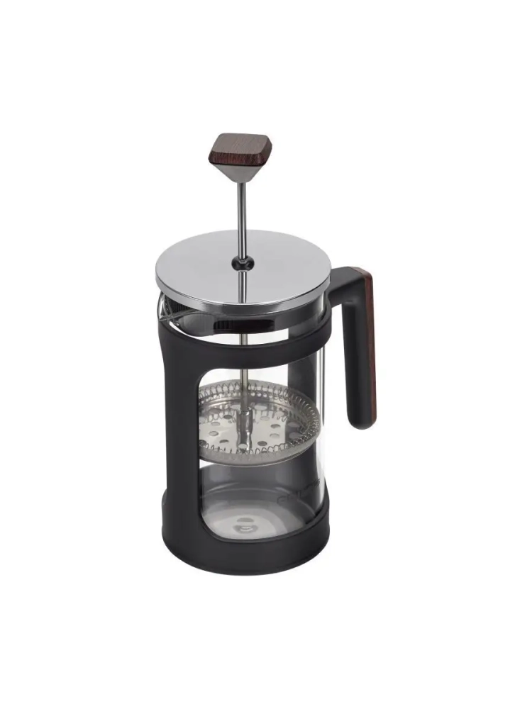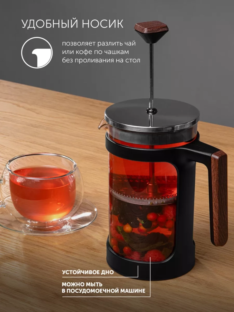 Внутри расположен эргономичный поршень выполненный из медицинской нержавеющей стали 18/10, что обеспечивает защиту от коррозии и предотвращает размножение вредных организмов, благодаря антибактериальным свойствам материала, в отличие от алюминиевых изделий. Френч-пресс имеет металлический сетчатый фильтр, который обеспечивает эффективную фильтрацию напитка и позволяет использовать мелко измельченные ингредиенты при заваривании. Прочное ситечко легко чистится и остается в идеальном состоянии на протяжении долгого времени. Двойное утолщенное дно колбы защищает поверхность стола от тепла и обеспечивает устойчивость. Удобная форма носика позволяет безопасно наливать напитки без проливания на стол. Прозрачный чайник из термостойкого материала надолго сохраняет тепло приготовленных напитков. Это гарантирует максимальное раскрытие чайных листьев во время заваривания и дает возможность хорошо настояться молотому кофе.