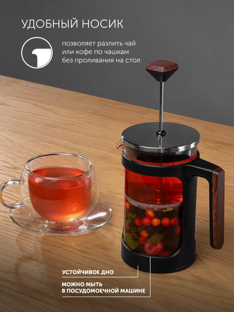 Внутри расположен эргономичный поршень выполненный из медицинской нержавеющей стали 18/10, что обеспечивает защиту от коррозии и предотвращает размножение вредных организмов, благодаря антибактериальным свойствам материала, в отличие от алюминиевых изделий. Френч-пресс имеет металлический сетчатый фильтр, который обеспечивает эффективную фильтрацию напитка и позволяет использовать мелко измельченные ингредиенты при заваривании. Прочное ситечко легко чистится и остается в идеальном состоянии на протяжении долгого времени. Двойное утолщенное дно колбы защищает поверхность стола от тепла и обеспечивает устойчивость. Удобная форма носика позволяет безопасно наливать напитки без проливания на стол. Прозрачный чайник из термостойкого материала надолго сохраняет тепло приготовленных напитков. Это гарантирует максимальное раскрытие чайных листьев во время заваривания и дает возможность хорошо настояться молотому кофе.