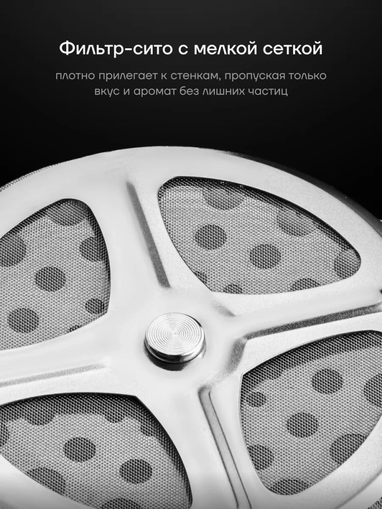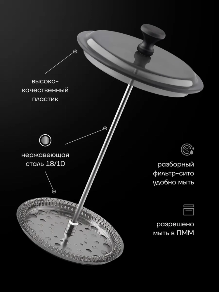 Эргономичный поршень выполнен из медицинской нержавеющей стали 18/10, что обеспечивает защиту от коррозии и предотвращает размножение вредных организмов, благодаря антибактериальным свойствам материала в отличие от алюминиевых изделий. Френч - пресс оснащен металлическим сетчатым фильтром, который способствует высокому качеству фильтрации напитка и позволяет использовать ингредиенты мелкого помола во время заварки. Прочное ситечко на фильтре легко моется и надолго сохраняет свой первозданный вид. Эргономичная ручка обеспечивает надежный хват, не скользит в руке во время использования. Двойное толстое дно колбы защищает поверхность стола от нагревания и обеспечивает устойчивость. Удобная форма носика позволяет разливать приготовленные напитки без проливания на стол. Крышка плотно прилегает к корпусу, что предотвращает ее выпадение даже при переворачивании заварного чайника. Крышка выполнена из высококачественного экологичного пластика. Объем емкости 1000 мл. В комплекте мерная ложка для заварки.