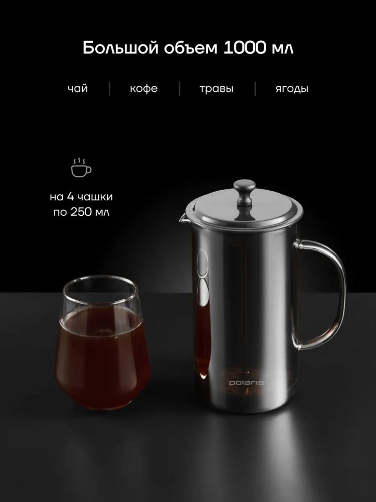 Профессиональный Френч-пресс Polaris Graphit- 1000FP - это универсальный заварочный чайник, который позволит вам насладиться чашечкой ароматного чая или кофе прямо у себя дома.