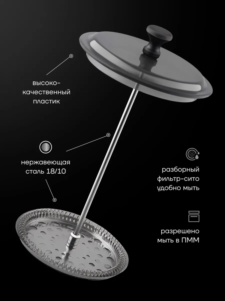 Маленький заварник сделан из высококачественных материалов, которые полностью безопасны для использования и соответствуют европейским стандартам качества. Корпус и ручка стеклянной колбы выполнены из жаропрочного стекла с дополнительным PVC покрытием. Такое покрытие делает колбу более прочной и предотвращает случайные царапины или сколы. Прозрачный термостойкий чайник отлично выдерживает высокие температуры и надолго сохраняет тепло приготовленных напитков. Это способствует максимальному раскрытию чайных листьев во время заваривания и дает возможность хорошо настояться молотому кофе. Эргономичный поршень выполнен из медицинской нержавеющей стали 18/10, что обеспечивает защиту от коррозии и предотвращает размножение вредных организмов, благодаря антибактериальным свойствам материала в отличие от алюминиевых изделий. Френч - пресс оснащен металлическим сетчатым фильтром, который способствует высокому качеству фильтрации напитка и позволяет использовать ингредиенты мелкого помола во время заварки. Прочное ситечко на фильтре легко моется и надолго сохраняет свой первозданный вид. Эргономичная ручка обеспечивает надежный хват, не скользит в руке во время использования. Двойное толстое дно колбы защищает поверхность стола от нагревания и обеспечивает устойчивость. Удобная форма носика позволяет разливать приготовленные напитки без проливания на стол. Крышка плотно прилегает к корпусу, что предотвращает ее выпадение даже при переворачивании заварного чайника. Крышка выполнена из высококачественного экологичного пластика. Объем емкости 600 мл. Посуда имеет современный и элегантный дизайн, который отлично впишется в интерьер любой кухни. В комплекте мерная ложка.Не отказывайте себе в удовольствии каждое, начните утро с чашечки вкусного кофе, приготовленного с помощью френч-пресса от Поларис