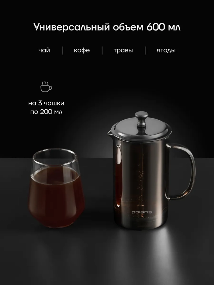 Профессиональный Френч-пресс Polaris Graphit 600FP - это универсальный заварочный чайник, который позволит вам насладиться чашечкой ароматного чая или кофе прямо у себя дома.