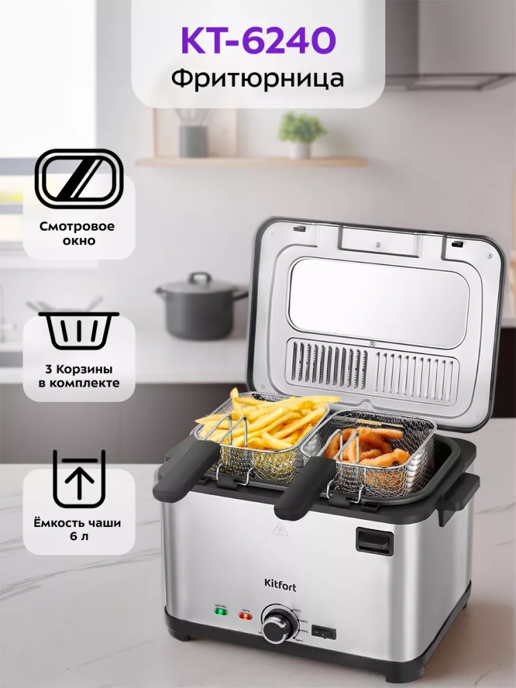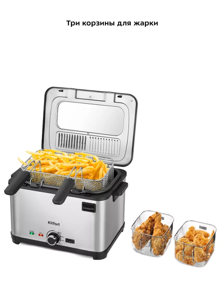 Фритюрница электрическая Kitfort КТ-6240 — это превосходное бытовое устройство для тех, кто ценит вкусную и хрустящую еду. Эта кухонная техника позволяет готовить разнообразные блюда, такие как картофель фри, пончики и куриные крылышки в домашних условиях. Фритюрница оснащена мощностью 2000 Вт, что обеспечивает быстрое нагревание масла и равномерное обжаривание продуктов со всех сторон. Электрический регулятор температуры позволяет точно установить нужный температурный режим приготовления. Индикатор нагрева подскажет момент достижения оптимальной температуры масла. В комплект входят три съемные корзины: одна большая для объемных порций и две малые для небольших закусок или гарниров. Съемный дизайн корзин облегчает их чистку и хранение. Крышка фритюрницы оснащена смотровым окном, через которое можно наблюдать за процессом приготовления без необходимости открывать крышку. Это помогает сохранить тепло внутри прибора и избежать разбрызгивания масла. Также в крышке установлен фильтр, который минимизирует распространение запахов во время жарки. Фритюрница Kitfort КТ-6240 имеет удобные боковые ручки для легкого перемещения по кухне или хранения после использования. Держатели шнура питания на задней части корпуса обеспечивают аккуратное хранение кабеля. Этот мощный электроприбор Китфорт идеально подходит не только для картошки фри или картофеля в кляре, но также справляется с приготовлением овощей, рыбы и мяса во фритюре с минимальным содержанием масла благодаря решетке из нержавеющей стали внутри чаши на несколько литров.