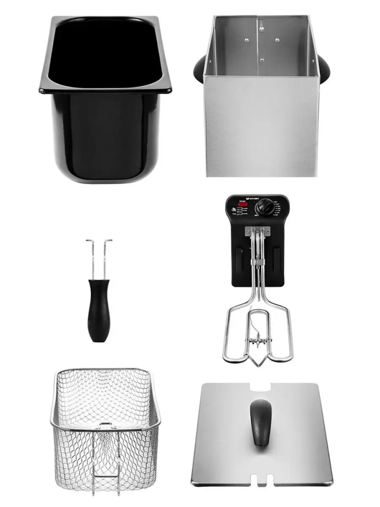 КТ-2022 укомплектована корзиной для жарки. У фритюрницы есть «холодная зона» — это зазор между чашей и нагревателем. Чем он больше, тем меньше греется корпус. Нагреватель расположен на дне чаши, поэтому осадки от продуктов на дне находятся в самом холодном месте, они не будут гореть и давать неприятный запах и привкус. Рекомендуется периодически, перед очередной закладкой продуктов, фильтровать масло или удалять осадки со дна чаши фритюрницы.