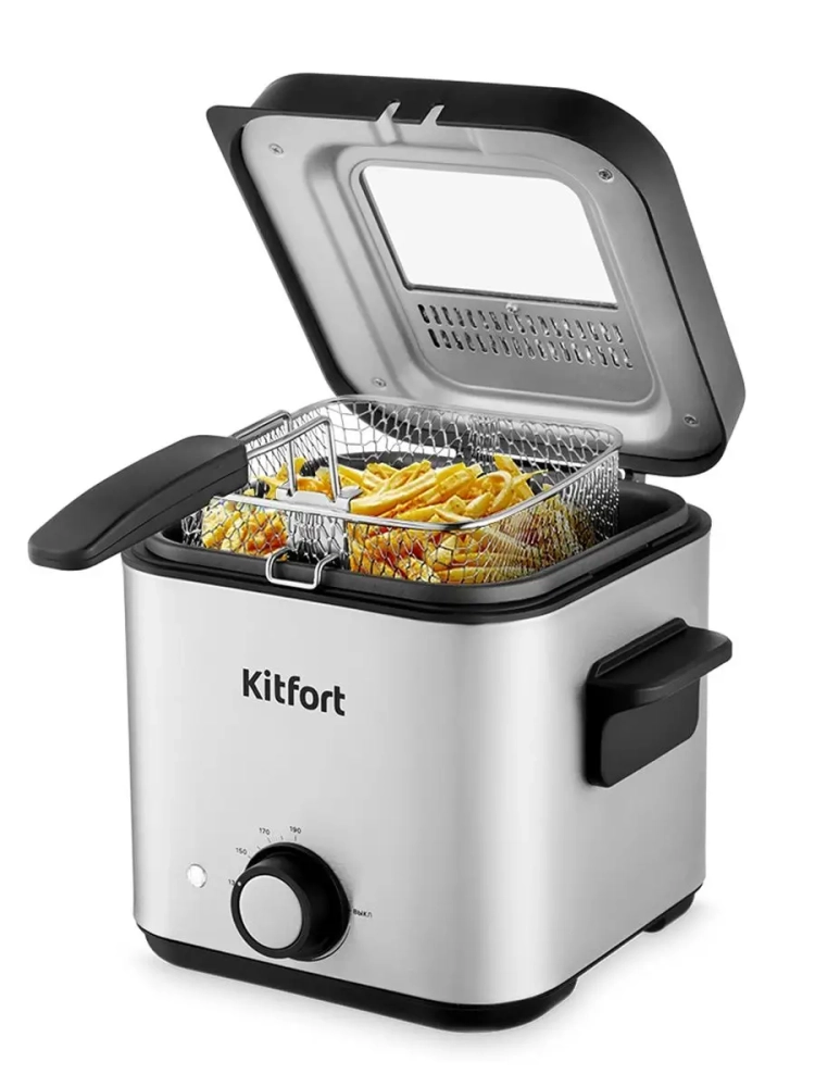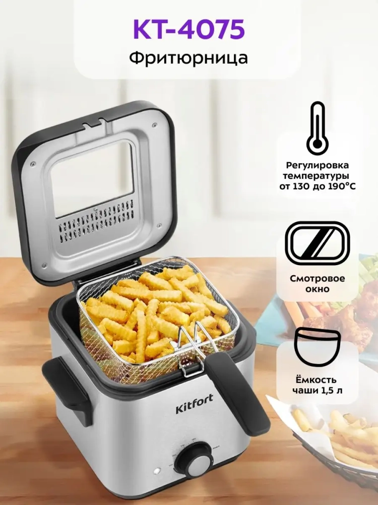 Фритюрница Kitfort КТ-4075 предназначена для приготовления продуктов в слое горячего масла. Прибор позволит вам приготовить любимые блюда, такие как картофель фри, пончики, чебуреки и куриные крылышки, в домашних условиях. Также можно жарить овощи, рыбу, мясо и морепродукты в кляре и без.