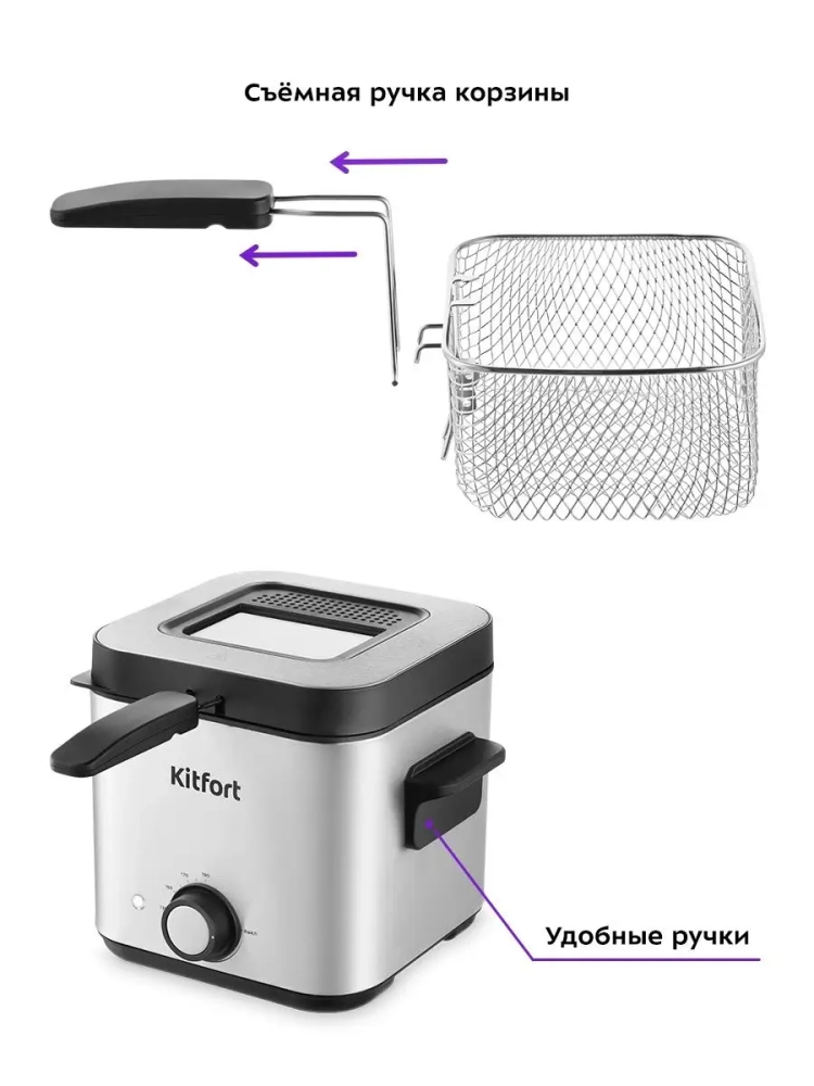 Фритюрница отличается компактностью. Две ручки по бокам прибора позволяют легко переносить фритюрницу. Для удобства хранения корзина для жарки имеет съемную ручку, в разобранном виде корзина и ручка помещаются внутрь фритюрницы.