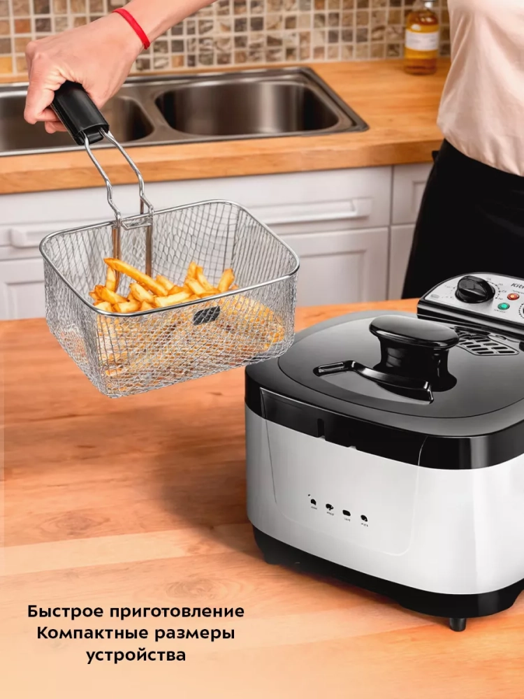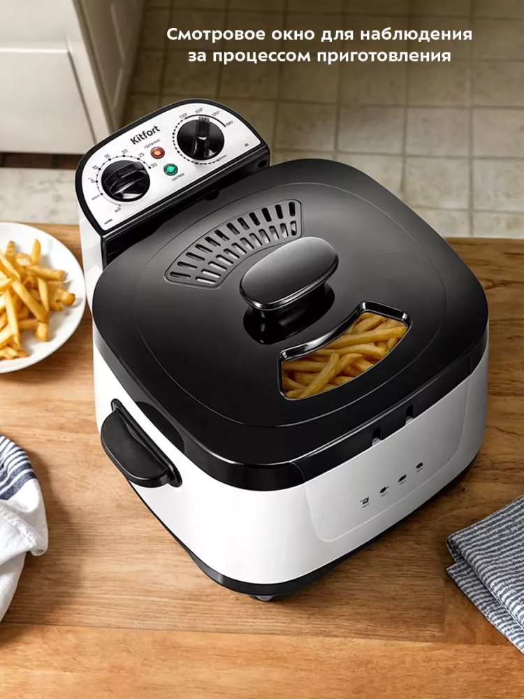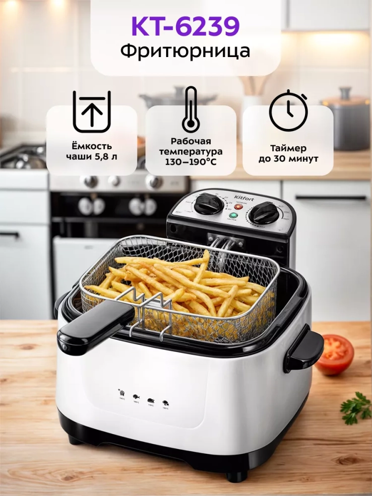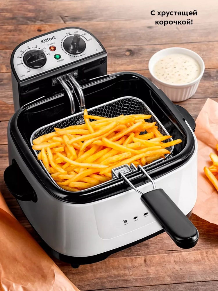 Фритюрница электрическая Kitfort КТ-6239 — это превосходный выбор для тех, кто ценит вкусные и хрустящие блюда. Этот электроприбор позволяет готовить разнообразные продукты, такие как картофель фри, картошка по-деревенски пончики и куриные крылышки в домашних условиях. Фритюрница оснащена съемной чашей, что упрощает процесс мытья после использования. Благодаря электрическому нагревателю вы сможете быстро приготовить любимые блюда. Готовка во фритюре имеет множество преимуществ по сравнению с традиционной жаркой на сковороде. Продукты обжариваются равномерно со всех сторон, что сокращает время приготовления и снижает содержание масла в готовом блюде. Хрустящая корочка сохраняет сочность внутри продукта без лишнего жира. Фритюрница от китфорт оборудована регуляторами температуры и таймером для точного контроля процесса приготовления. Съемный нагреватель обеспечивает удобство ухода за прибором: остатки продуктов не пригорают и не остаются на сетке благодаря "холодной зоне" между чашей и нагревателем. Для удобства использования предусмотрены съемная ручка корзины для жарки и две боковые ручки для переноски прибора. В крышке имеется смотровое окно, позволяющее следить за процессом готовности без необходимости открывать крышку. Крышка также оснащена фильтром, который предотвращает распространение маслянистых испарений через отверстия для выхода пара. Защитный переключатель не позволит включиться фритюрнице при неправильной установке блока управления с нагревателем на корпусе прибора. Дополнительная защита от перегрева обеспечивается встроенным термостатом: он отключит устройство при превышении допустимой температуры и автоматически включится после остывания устройства при нажатии кнопки "Restart".