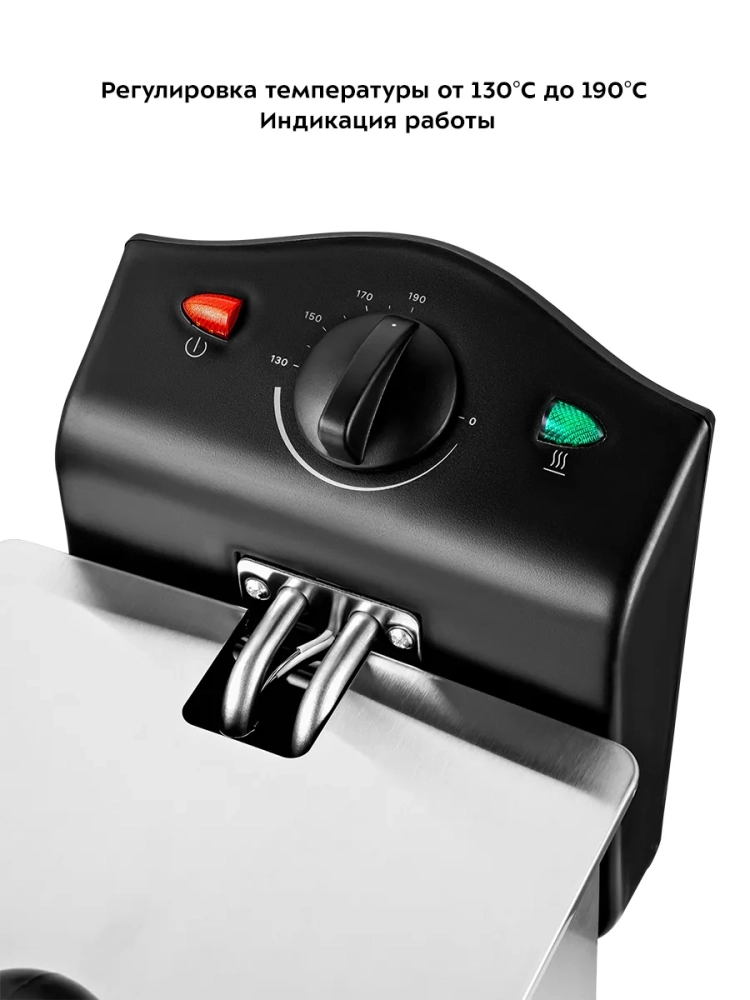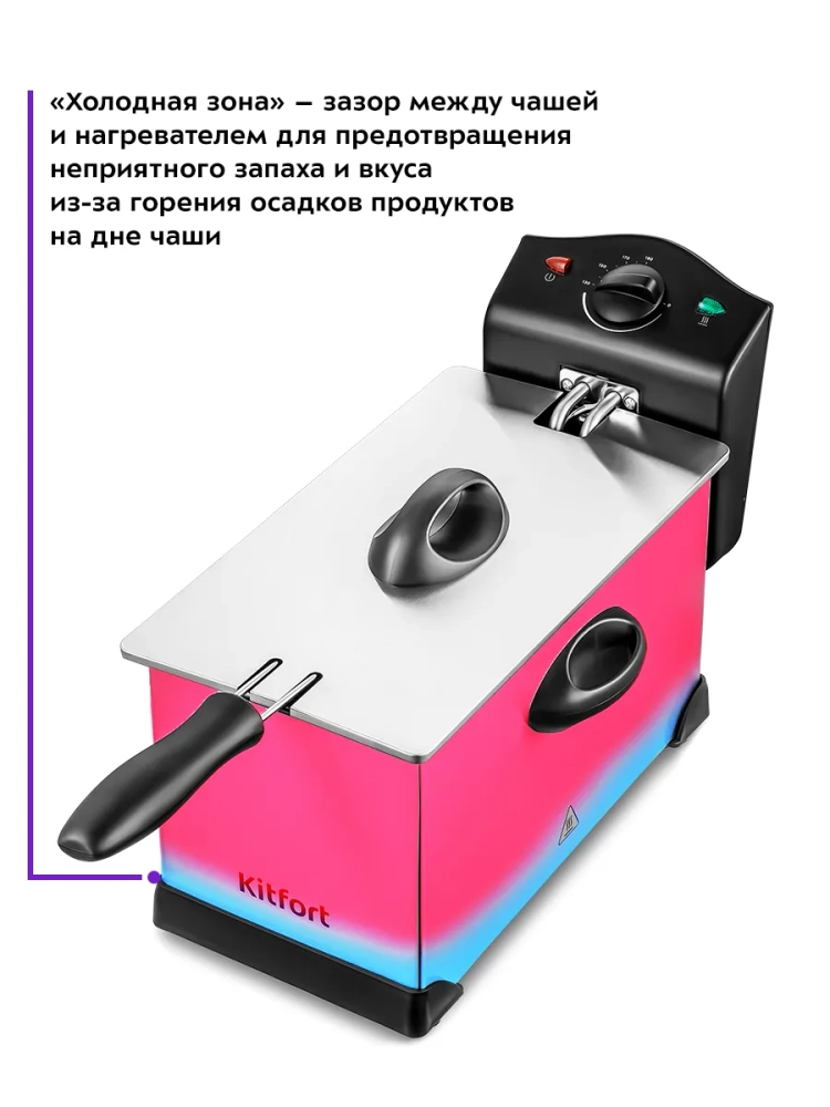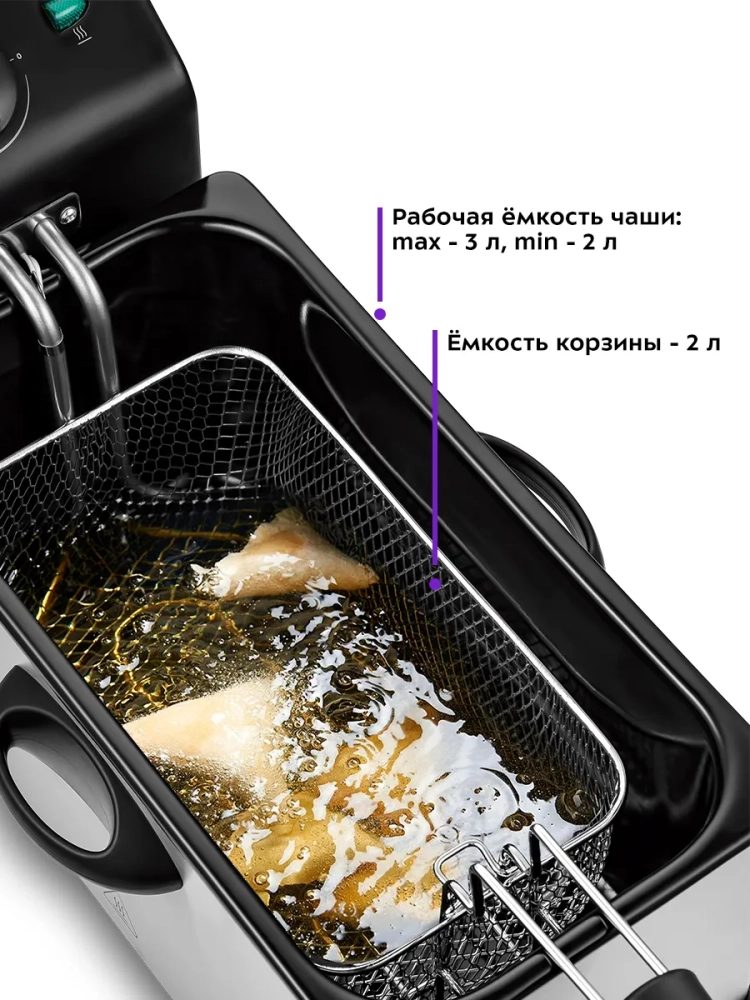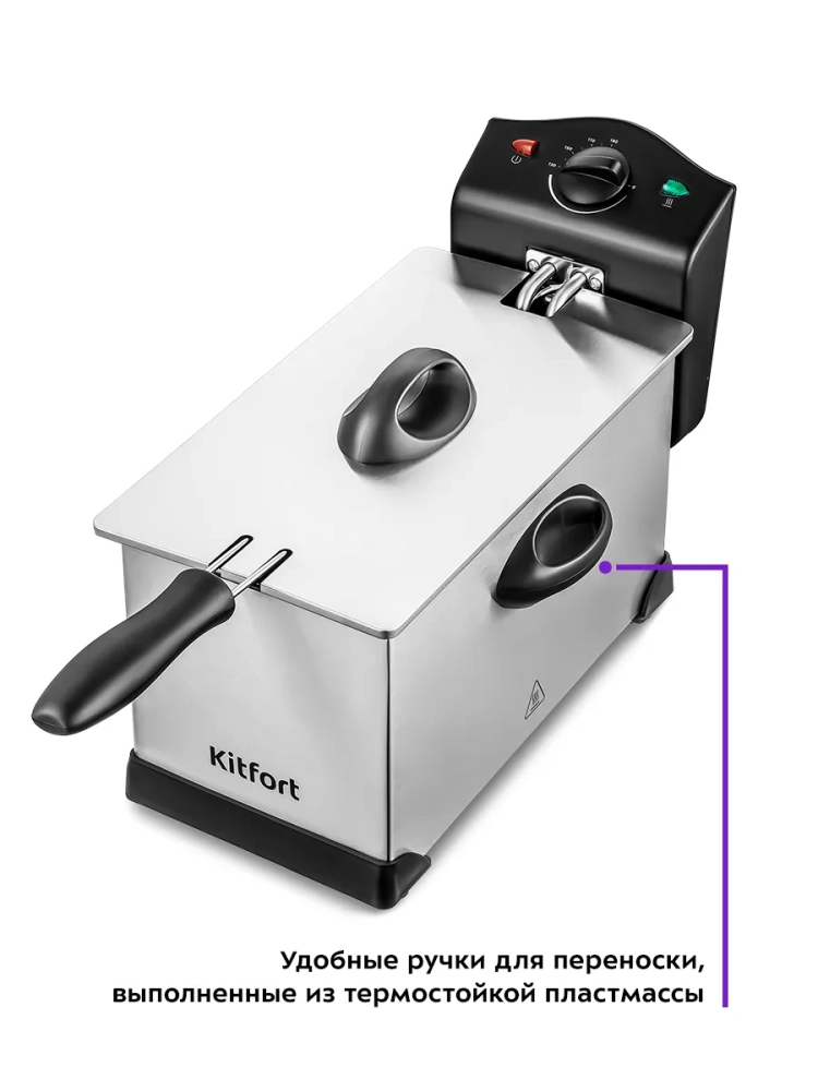 Нагреватель во фритюрнице съемный погружной и при установке в чашу не достает до дна. Поэтому осадки от продуктов на дне чаши находятся в самом холодном месте, они не будут гореть и давать неприятный запах и привкус. Рекомендуется периодически, перед очередной закладкой продуктов, фильтровать масло или удалять осадки со дна чаши фритюрницы. С помощью регулятора вы можете плавно менять температуру приготовления. Фритюрница КТ-4051 укомплектована корзиной для жарки. Боковые ручки, ручки крышки и корзины выполнены из термостойкой пластмассы. Корпус, крышка и корзина выполнены из нержавеющей стали. Крышка фритюрницы является съемной, поэтому ее легко мыть. Блок управления с нагревателем просто снимается с фритюрницы, чтобы появилась возможность достать чашу и вымыть ее. Для экономии места при хранении предусмотрена съемная ручка корзины. Устройство имеет отсек для хранения шнура питания. У фритюрницы есть защита от перегрева. При перегреве сработает термостат, который отключит фритюрницу.
