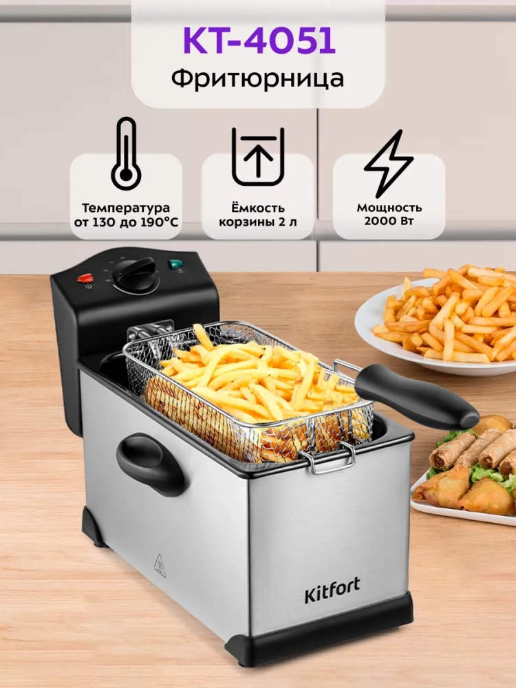 Во фритюрнице Kitfort КТ-4051 продукты жарятся в глубоком слое горячего масла. Продукты во фритюре готовятся быстрее, чем на сковороде из-за короткого воздействия высокой температуры со всех сторон. Несмотря на то, что продукты готовятся в масле, в жаренных во фритюре продуктах масла обычно содержится меньше, чем в жаренных на сковороде. Хорошо зажаренные во фритюре продукты покрыты хрустящей корочкой, под которой почти нет масла.