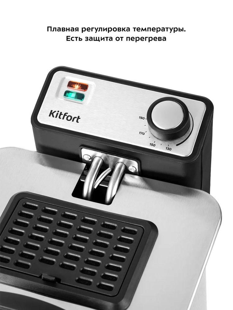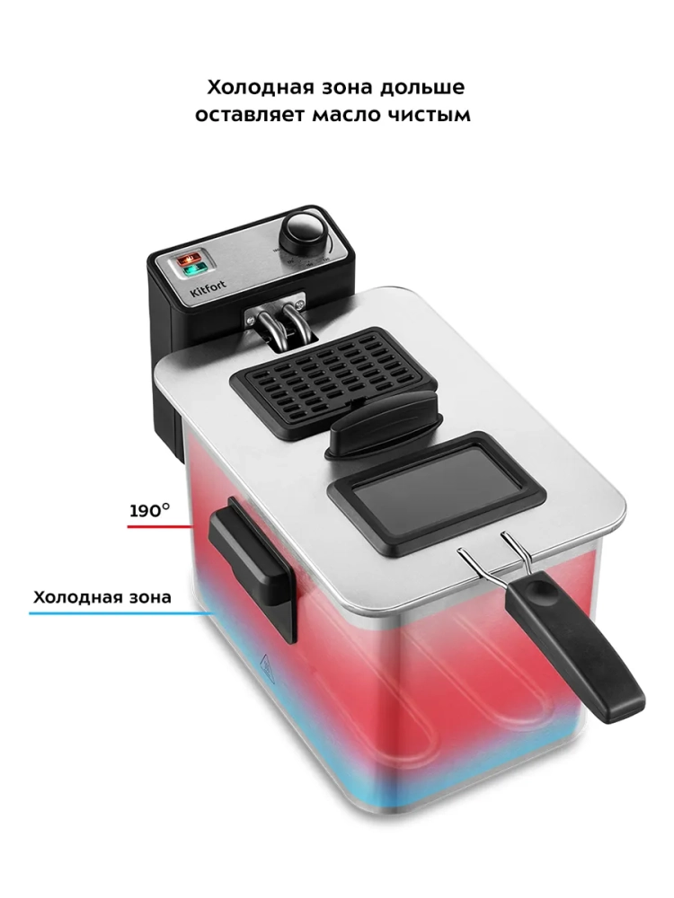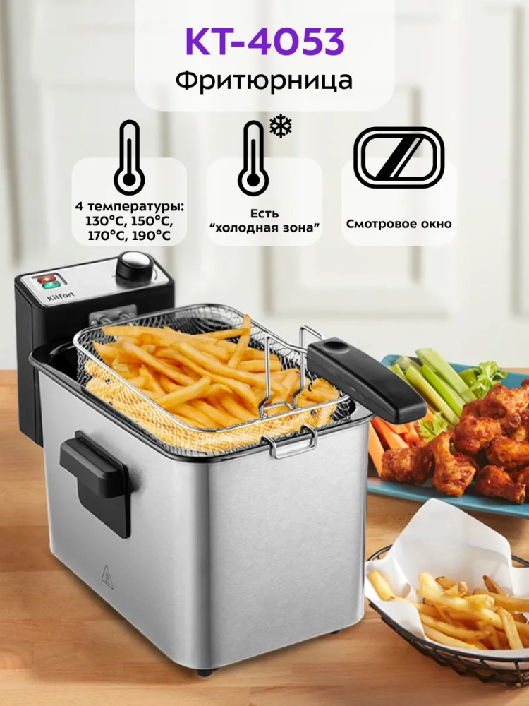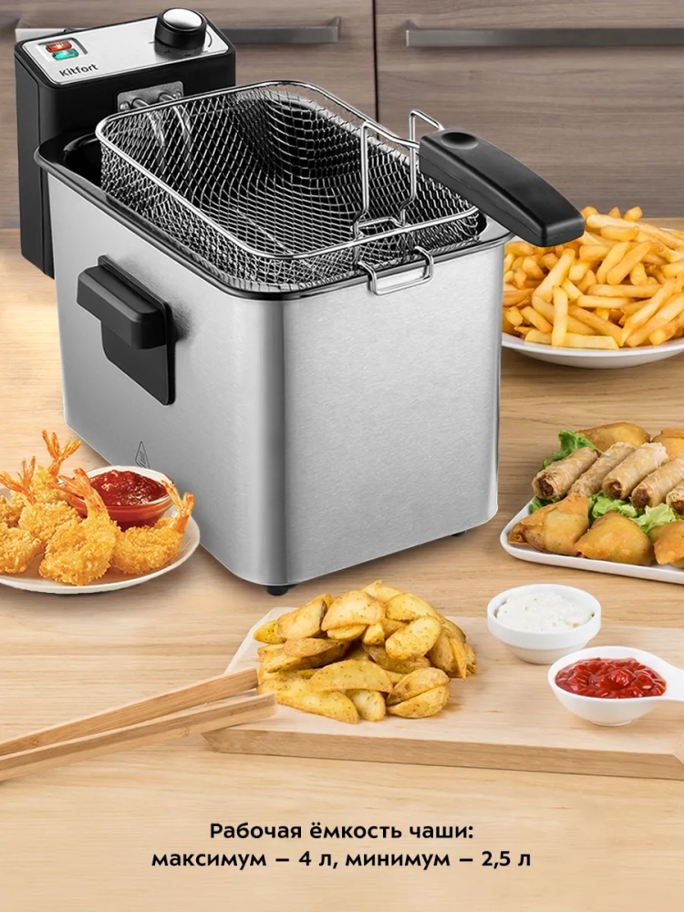 Во фритюрнице Kitfort КТ-4053 продукты жарятся в глубоком слое горячего масла. Продукты во фритюре готовятся быстрее, чем на сковороде из-за короткого воздействия высокой температуры со всех сторон. Несмотря на то, что продукты готовятся в масле, в жаренных во фритюре продуктах масла обычно содержится меньше, чем в жаренных на сковороде. Хорошо зажаренные во фритюре продукты покрыты хрустящей корочкой, под которой почти нет масла. Во фритюре можно готовить картофель фри и картофель по-деревенски, чипсы, овощи, рыбу, мясо и птицу, куриные окорочка и крылышки, креветки. Все это можно жарить в кляре и без кляра. Кроме этого, можно жарить котлеты, чебуреки, пельмени, фрикадельки, пирожки, беляши, пышки, пончики и многое другое, например, луковые кольца, кольца кальмаров, грибы и даже соленья. У фритюрницы есть «холодная зона» — это зазор между чашей и нагревателем. Нагреватель во фритюрнице съемный погружной и при установке в чашу не достает до дна. Поэтому осадки от продуктов на дне чаши находятся в самом холодном месте, они не будут гореть и давать неприятный запах и привкус. Рекомендуется периодически, перед очередной закладкой продуктов, фильтровать масло или удалять осадки со дна чаши фритюрницы. С помощью регулятора вы можете плавно менять температуру приготовления. Фритюрница КТ-4053 укомплектована корзиной для жарки. Боковые ручки, ручки крышки и корзины выполнены из термостойкой пластмассы. Корпус, крышка и корзина выполнены из нержавеющей стали. Крышка фритюрницы является съемной, поэтому ее легко мыть. В крышке фритюрницы имеется смотровое окно, через которое вы сможете следить за степенью готовности блюда, не поднимая крышку. Фильтры на вентиляционной решетке поможет сдержать распространения запаха и маслянистых испарений во время жарки. Блок управления с нагревателем просто снимается с фритюрницы, чтобы появилась возможность достать чашу и вымыть ее. Для экономии места при хранении предусмотрена съемная ручка корзины.