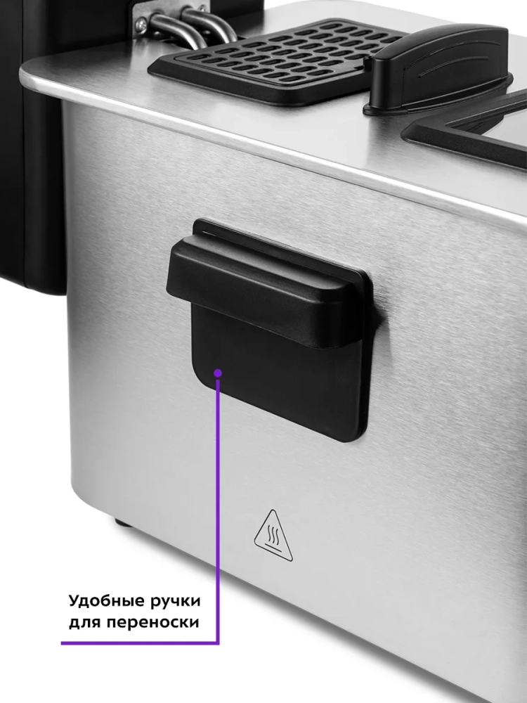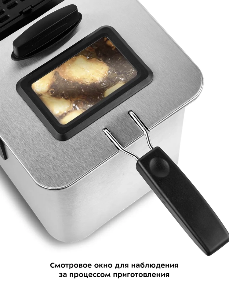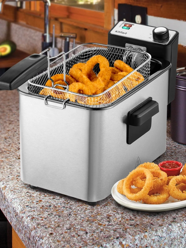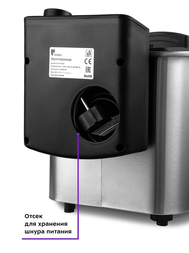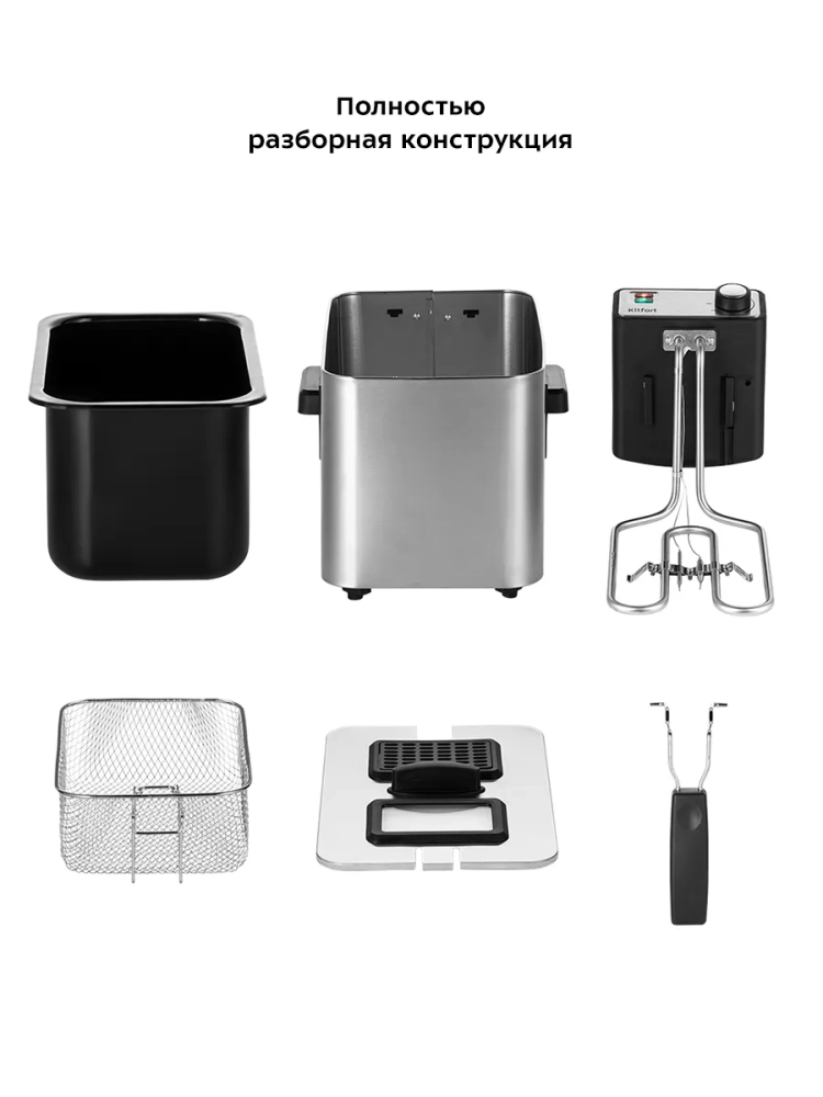 Во фритюрнице Kitfort КТ-4053 продукты жарятся в глубоком слое горячего масла. Продукты во фритюре готовятся быстрее, чем на сковороде из-за короткого воздействия высокой температуры со всех сторон. Несмотря на то, что продукты готовятся в масле, в жаренных во фритюре продуктах масла обычно содержится меньше, чем в жаренных на сковороде. Хорошо зажаренные во фритюре продукты покрыты хрустящей корочкой, под которой почти нет масла. Во фритюре можно готовить картофель фри и картофель по-деревенски, чипсы, овощи, рыбу, мясо и птицу, куриные окорочка и крылышки, креветки. Все это можно жарить в кляре и без кляра. Кроме этого, можно жарить котлеты, чебуреки, пельмени, фрикадельки, пирожки, беляши, пышки, пончики и многое другое, например, луковые кольца, кольца кальмаров, грибы и даже соленья. У фритюрницы есть «холодная зона» — это зазор между чашей и нагревателем. Нагреватель во фритюрнице съемный погружной и при установке в чашу не достает до дна. Поэтому осадки от продуктов на дне чаши находятся в самом холодном месте, они не будут гореть и давать неприятный запах и привкус. Рекомендуется периодически, перед очередной закладкой продуктов, фильтровать масло или удалять осадки со дна чаши фритюрницы. С помощью регулятора вы можете плавно менять температуру приготовления. Фритюрница КТ-4053 укомплектована корзиной для жарки. Боковые ручки, ручки крышки и корзины выполнены из термостойкой пластмассы. Корпус, крышка и корзина выполнены из нержавеющей стали. Крышка фритюрницы является съемной, поэтому ее легко мыть. В крышке фритюрницы имеется смотровое окно, через которое вы сможете следить за степенью готовности блюда, не поднимая крышку. Фильтры на вентиляционной решетке поможет сдержать распространения запаха и маслянистых испарений во время жарки. Блок управления с нагревателем просто снимается с фритюрницы, чтобы появилась возможность достать чашу и вымыть ее. Для экономии места при хранении предусмотрена съемная ручка корзины.