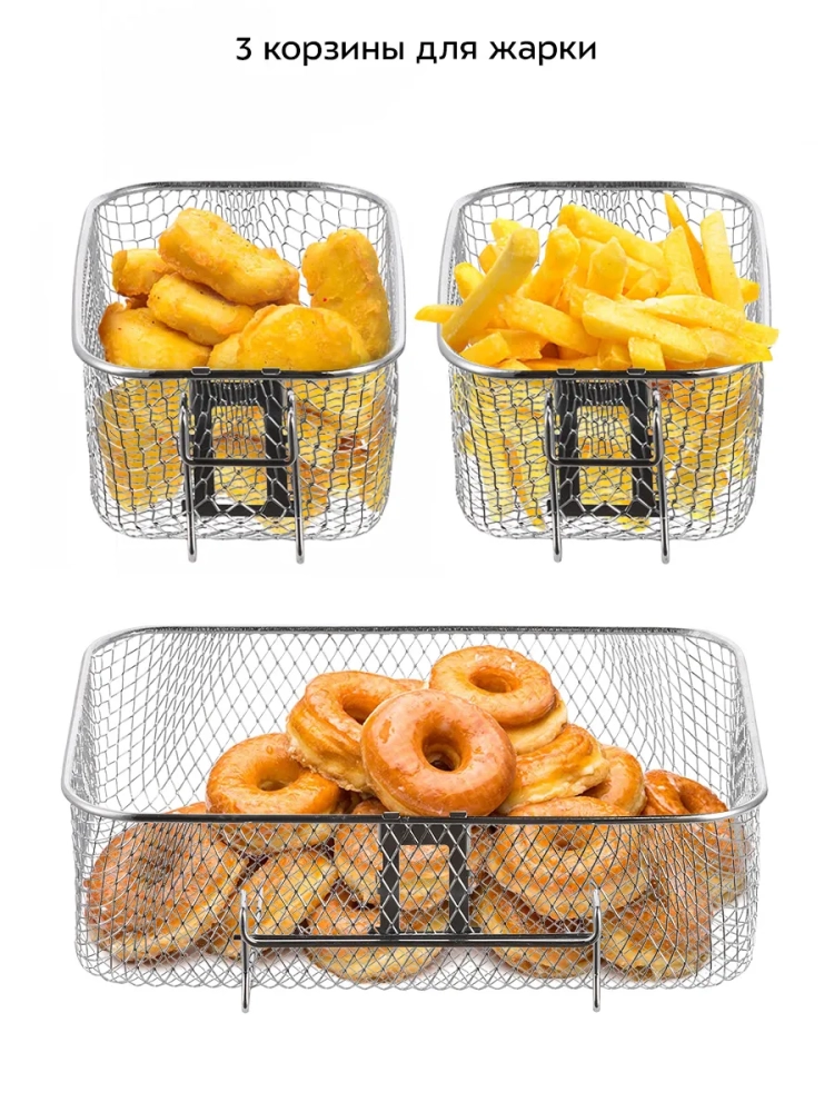 В комплекте три корзины для жарки: одна большая и две малые. Для удобства хранения ручки корзин снимаются.